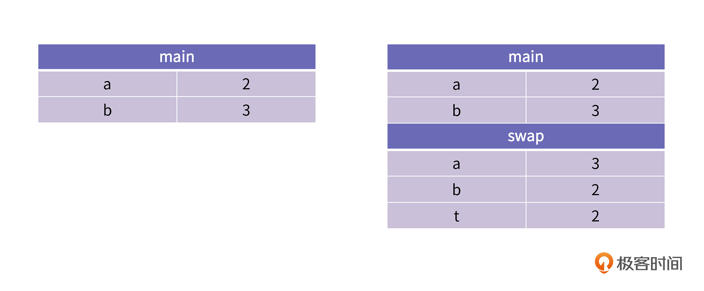 在main函数执行的时候,main的栈帧里存在变量a和b。当main在调用swap方法的时候,会在main的帧下面新建swap的栈帧。swap的帧里也有局部变量a和b,但是明显这个a、b与main函数里的a、b没有任何关系,不管对swap的帧里的a/b变量做任何操作都不会影响main函数的栈帧。