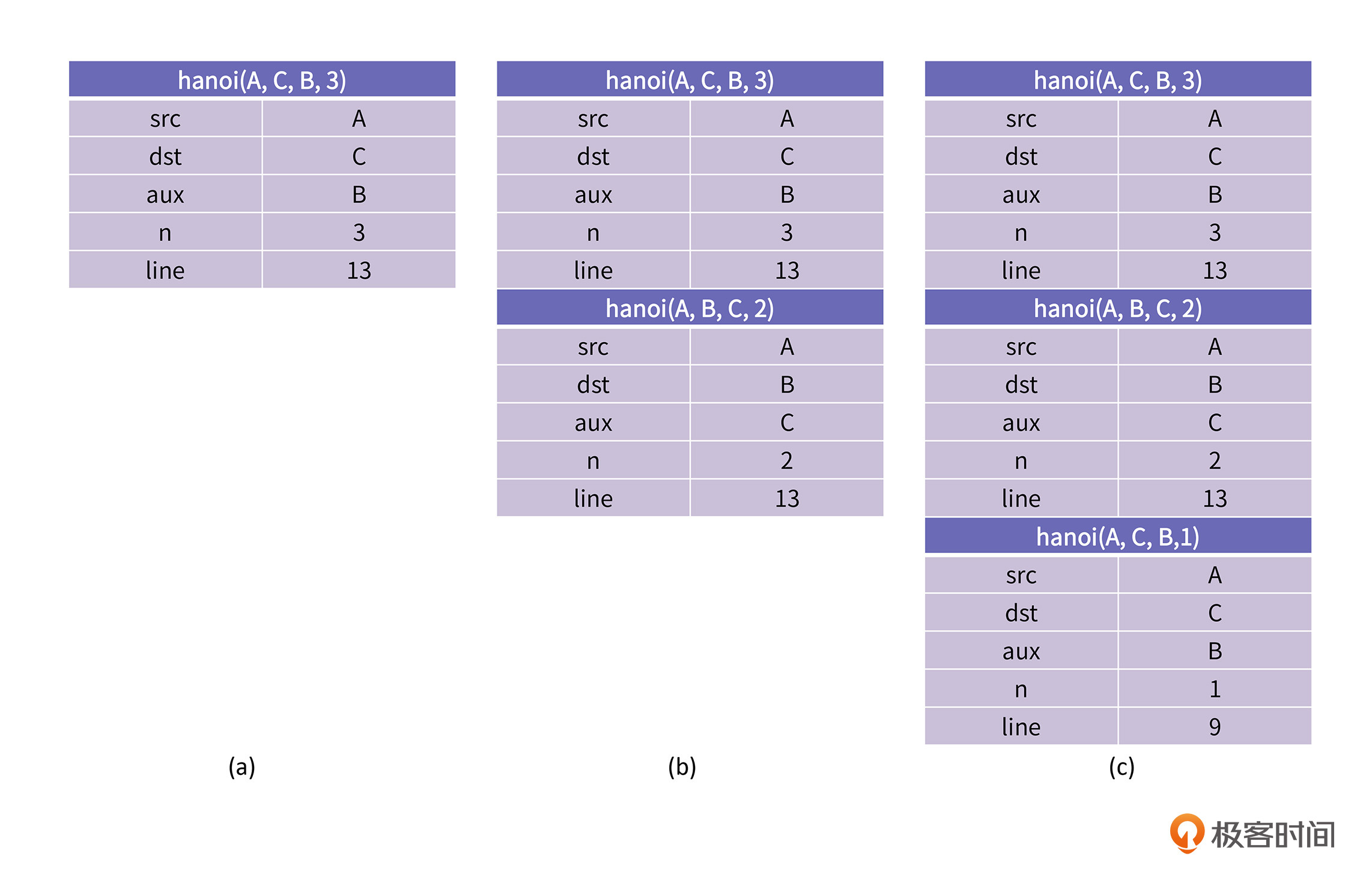 可以看到,当程序在执行hanoi(A, C, B, 3)时,CPU会为其创建一个栈帧,这一帧里记录着变量src、dst、aux和n。