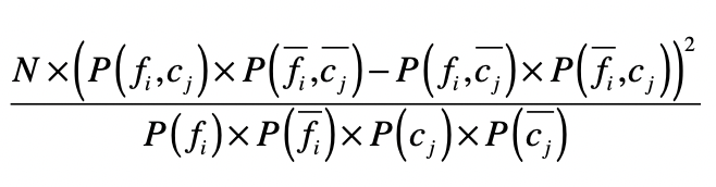在统计学中,我们使用卡方检验来检验两个变量是否相互独立。把它运用到特征选择,我们就可以检验特征与分类这两个变量是否独立。如果两者独立,证明特征和分类没有明显的相关性,特征对于分类来说没有提供足够的信息量。反之,如果两者有较强的相关性,那么特征对于分类来说就是有信息量的,是个好的特征。为了检验独立性,卡方检验考虑了四种情况的概率:$P(f_{i},c_{j})$ 、$P(\bar{f_{i}} ,\bar{c_{j}})$、$P(f_{i},\bar{c_{j}})$和$P(\bar{f_{i}},c_{j})$。
