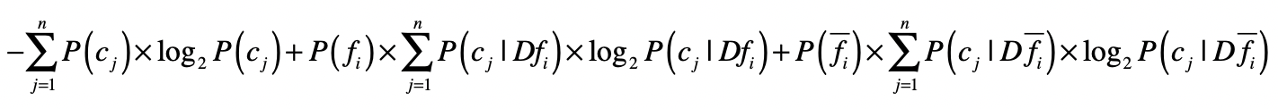 为了改进这一点,我们可以借用决策树中信息增益的概念。我们把单个特征f是不是出现作为一个决策条件,将数据集分为$Df_{i}$ 和$D\bar{f_{i}}$ ,$Df_{i}$表示出现了这个特征的数据,而$D\bar{f_{i}}$表示没有出现这个特征的数据。那么使用特征$f_{i}$进行数据划分之后,我们就能得到基于两个新数据集的熵,然后和没有划分之前的熵进行比较,得出信息增益。