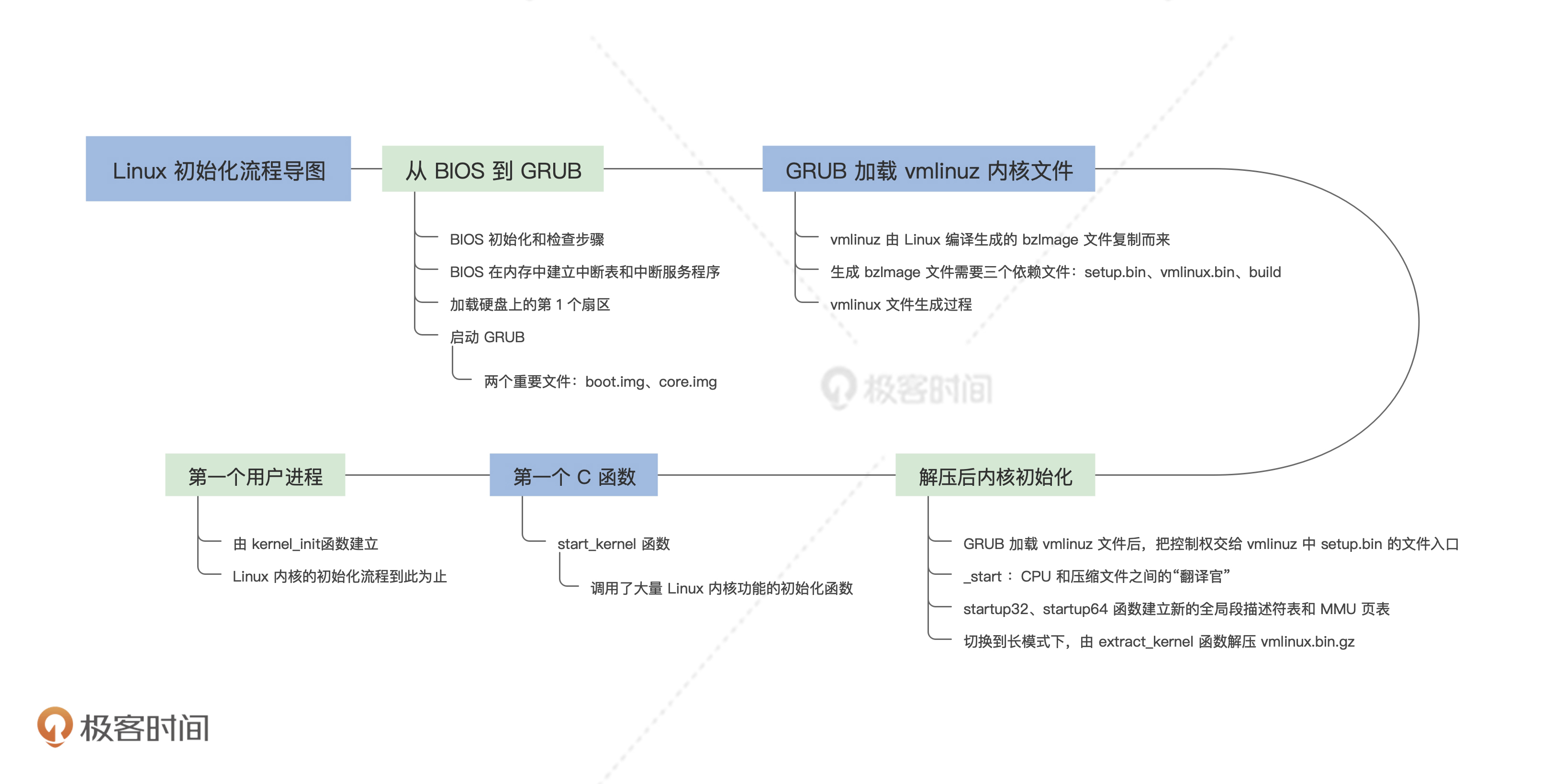 又到了课程尾声,Linux初始化流程的学习我们就告一段落了,我来给你做个总结。