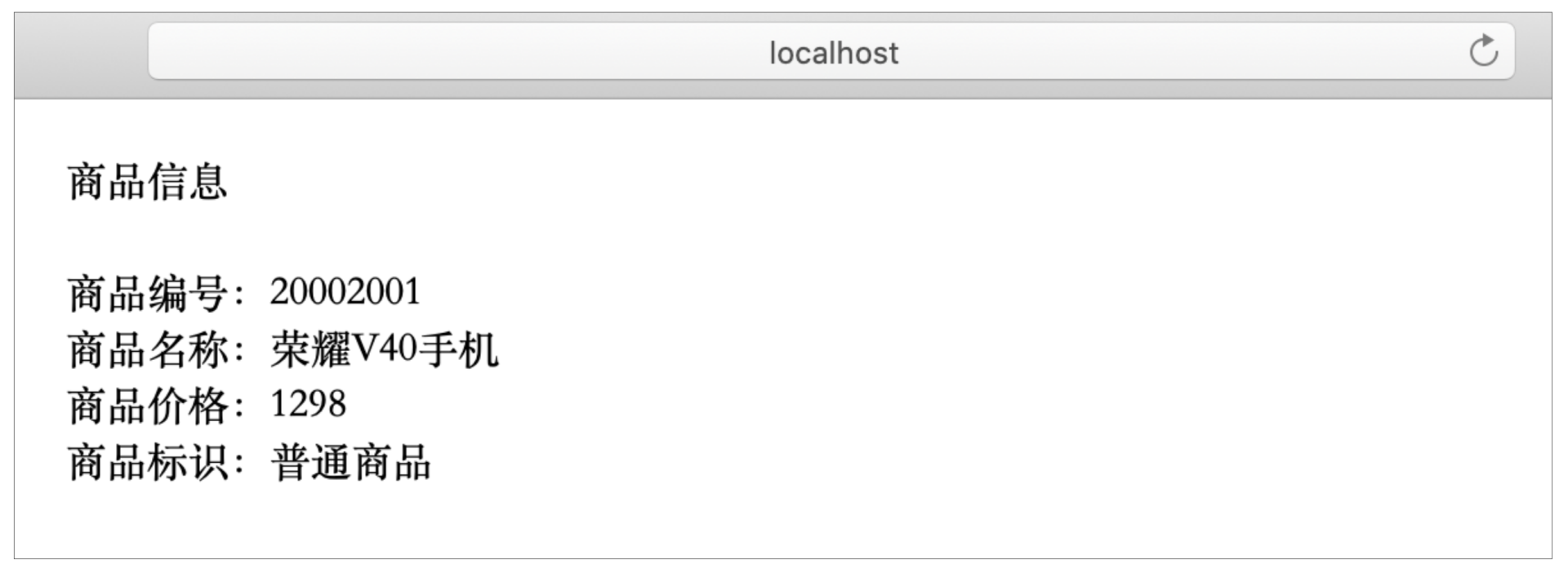 我们先在数据库商品表中初始化一条商品信息,用来模拟参加秒杀活动。然后再通过商品信息查询接口,在浏览器页面查看商品的信息(根据商品编号查询),这是个后台功能,主要是看下商品的基本信息,比如名称、价格、商品标识,特别是商品标识在参加秒杀活动前后的一个变化。