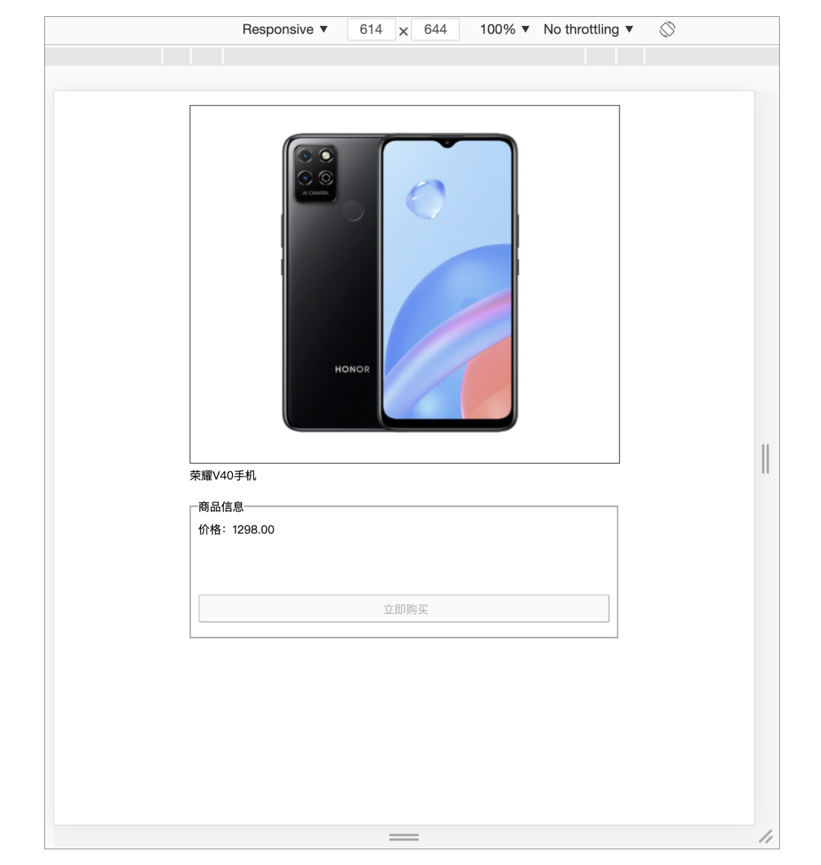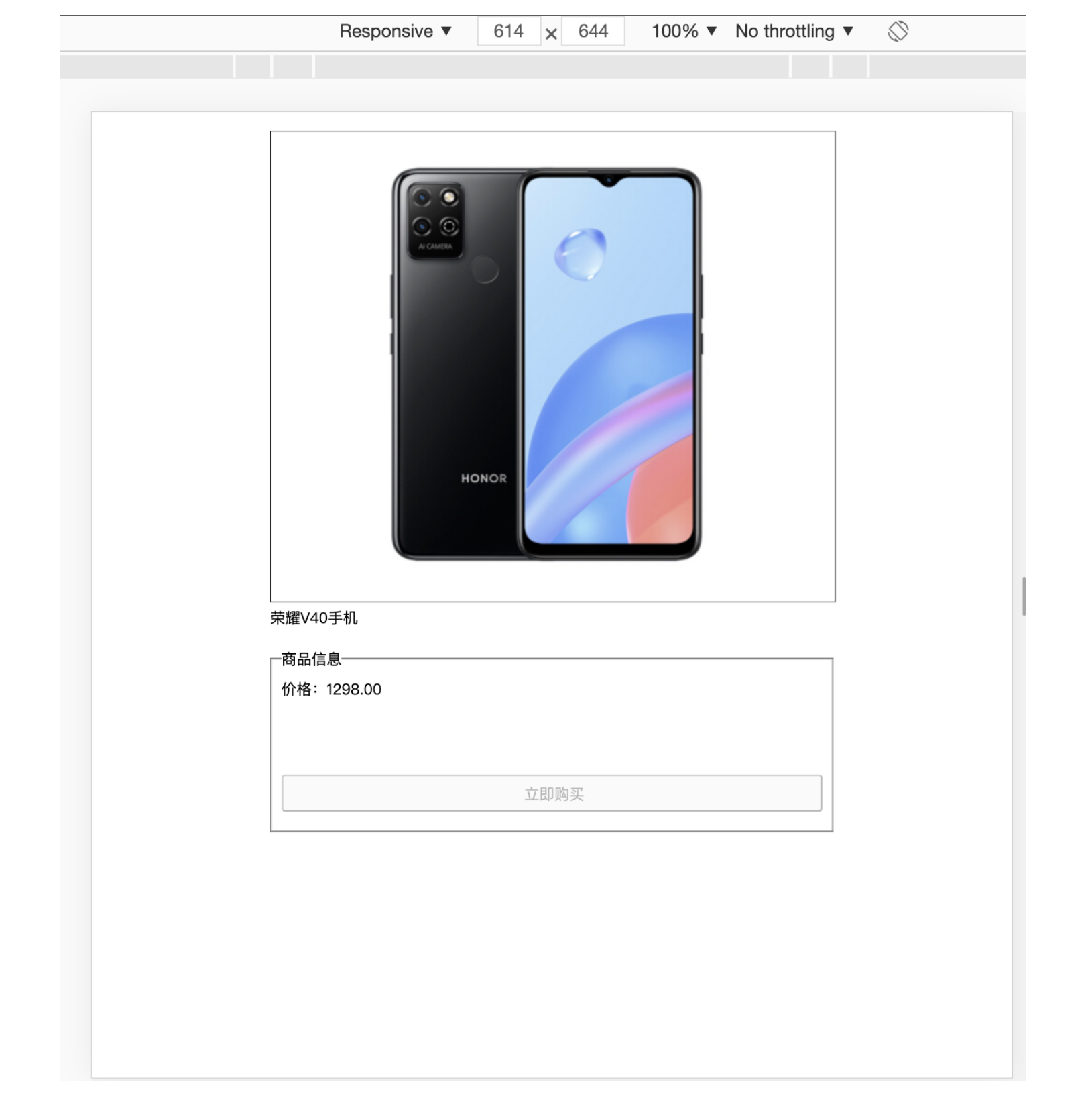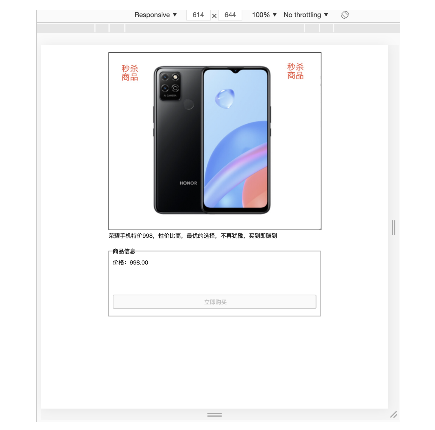 对比之前的商详页,我们可以看到商品的图片、名称、价格展示,都已经变成了活动配置的,同时按钮也变成了立即抢购,并可以点击,说明到这里我们一切都进展的很顺利!