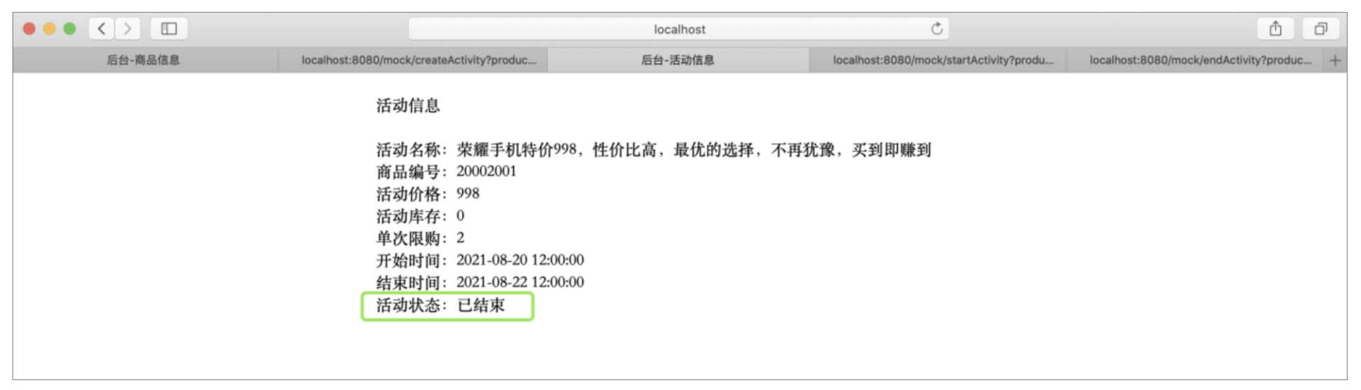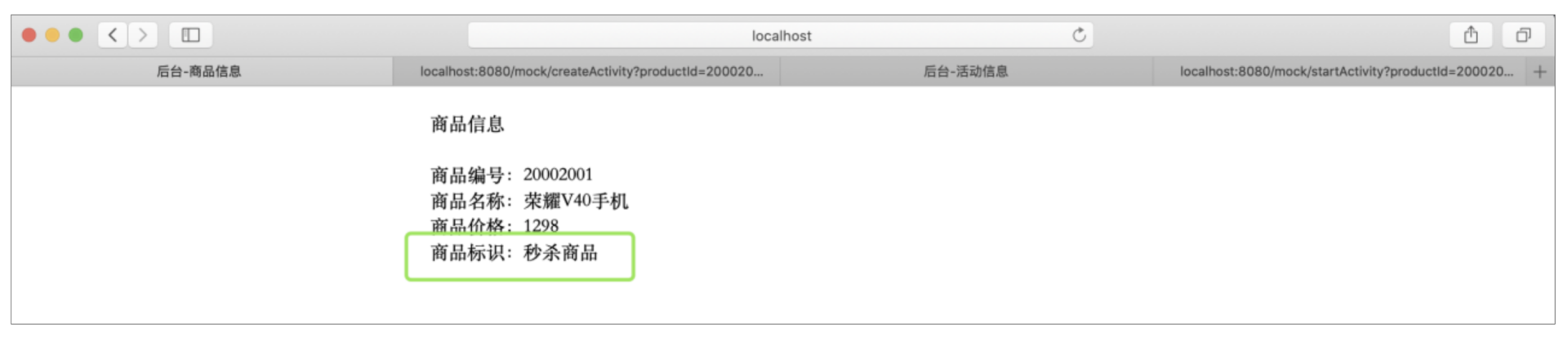 这样活动就触发成功了,这个时候,我们再分别看下活动信息和商品信息,看看都有什么变化:
