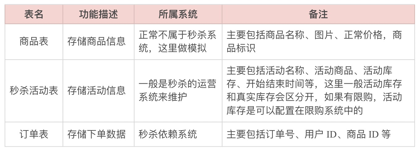 同时为了我们整个秒杀功能的展示,我们还需要有模拟商品信息的查询(后台查看),客户端商品的详情页面(秒杀入口)以及下单成功后的收银台页面,这3个一般情况下不属于秒杀整个系统的功能范畴了,这里仅仅是为了更好地展示秒杀的整个链路所做的模拟。