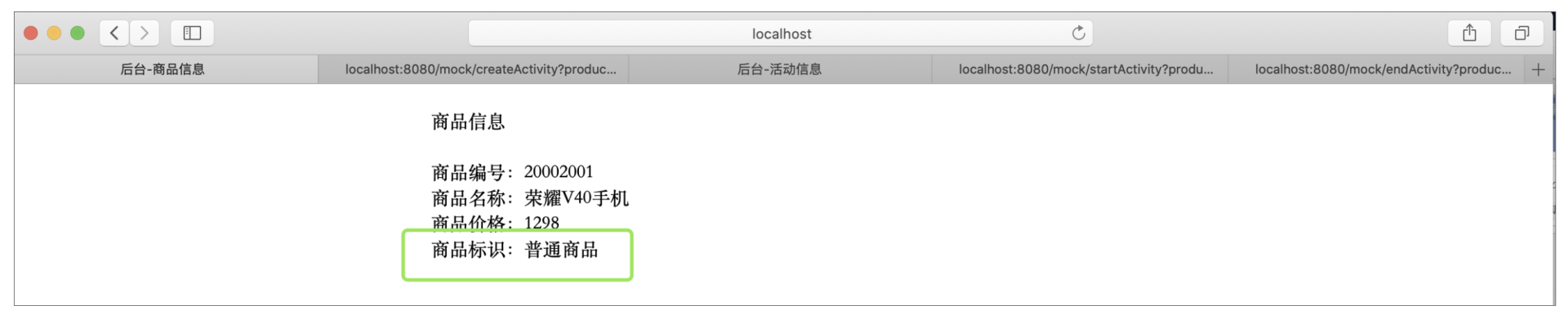 可以看到,活动虽然创建了,但还没有开始,所以这里展示的还是普通商品的名称和价格。下面我们就来手动触发一下,让活动开始,直接调用demo-web的活动开始接口: