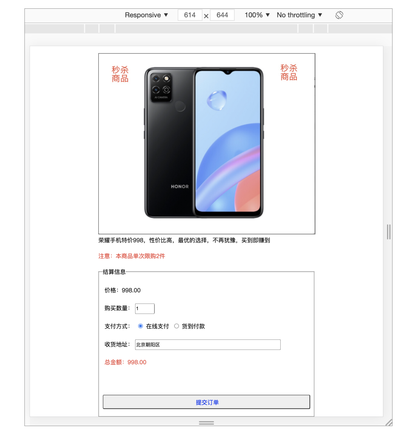 这时,我们点击立即抢购按钮,去进入到秒杀结算页。这里点击按钮,调用的是进结算页页面(H5)接口,在加载了HTML后,JavaScript通过Ajax调用结算页页面初始化渲染所需数据的接口,去渲染页面展示,效果如下: