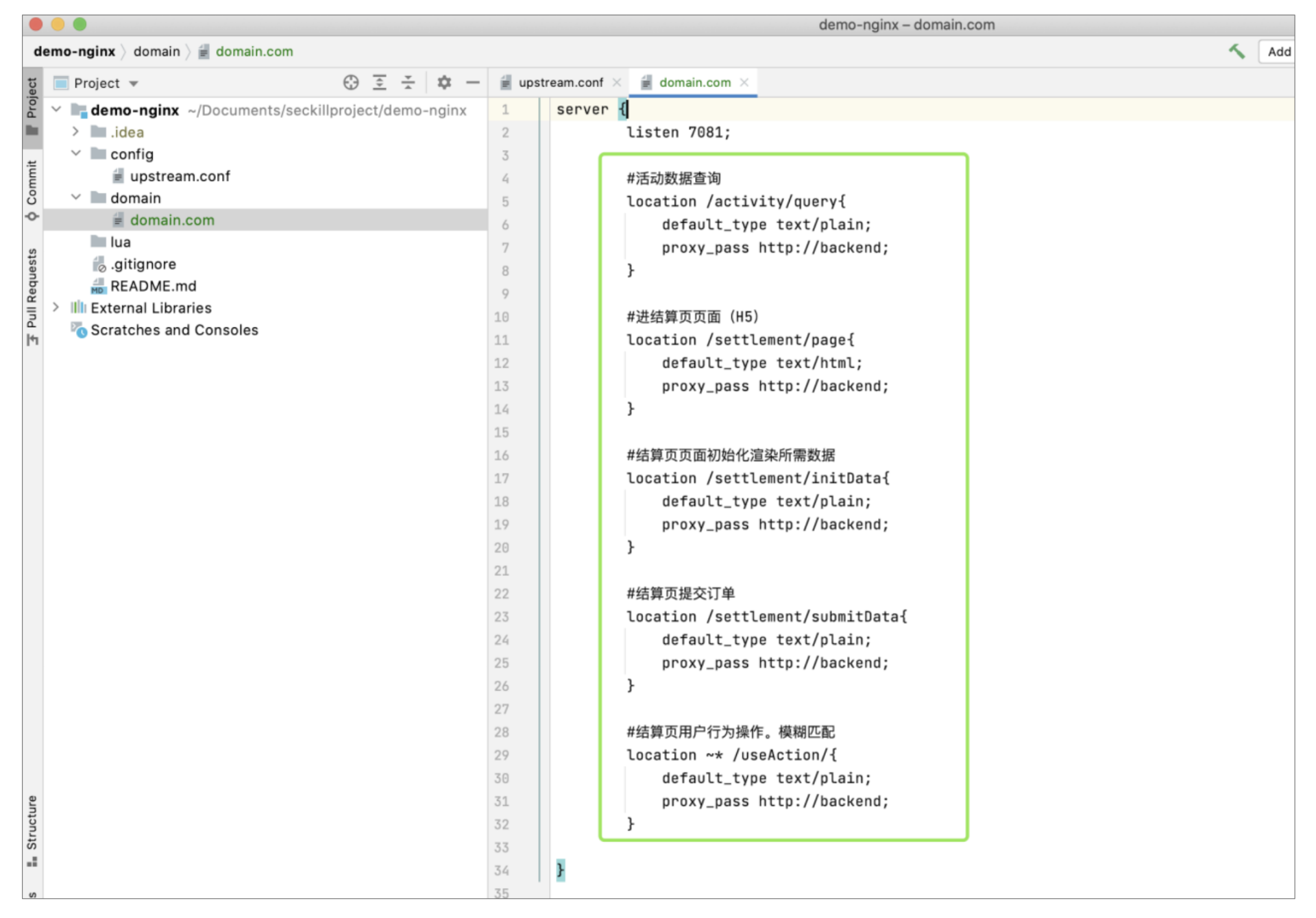 这里我主要说一下demo-nginx的配置,因为我们前面说过,初版先用比较传统的结构来实现秒杀,这样一来主要功能的开发都放在了demo-web和demo-support,所以我们的demo-nginx现在还不会有太多的配置更改。只需要将对应的接口URL匹配,配置到domain.com里即可,实现对应接口请求的接收和分发,修改后文件内容如下: