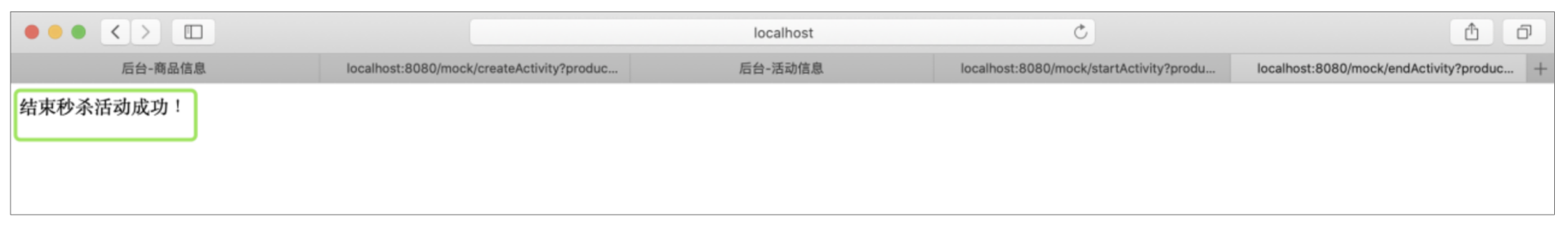 正常情况下,当商品售完时,活动也应该关闭掉了。因为我们没有worker,所以我们就来手动关闭一下,和触发活动开始一样,调用活动关闭的接口,去关闭活动并将商品的标识恢复成普通商品,如下图所示: