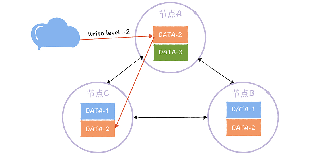从图中你可以看到,DATA-2的写副本数为2,也就说,对DATA-2执行写操作时,完成了2个副本的更新(比如节点A、C),才完成写操作。