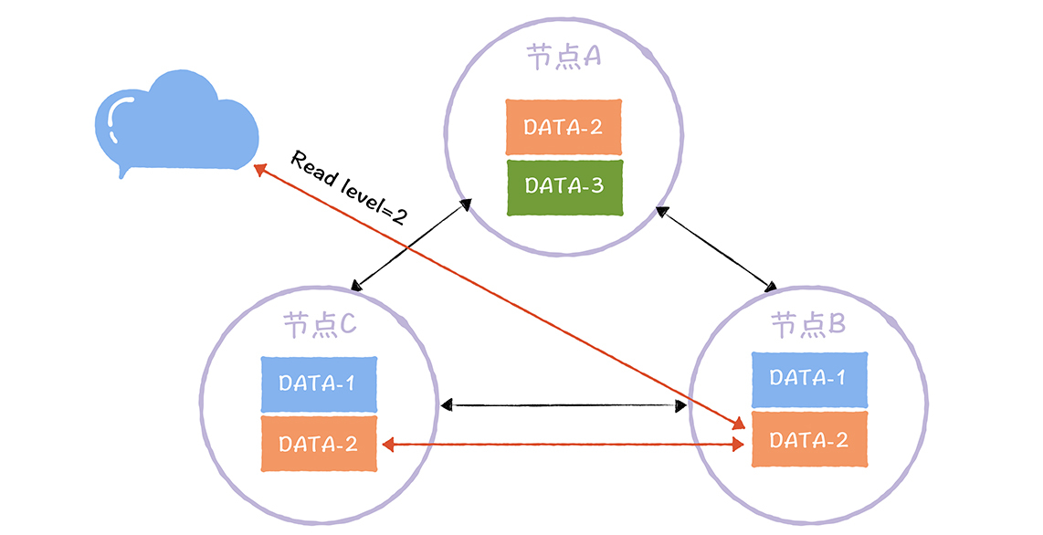 那么有的同学会问了,DATA-2有3个数据副本,完成了2副本的更新,就完成了写操作,那么如何实现强一致性呢?如果读到了第三个数据副本(比如节点B),不就可能无法读到更新后的值了吗?别急,我讲完如何执行读操作后,你就明白了。