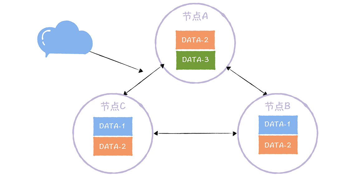 这里需要你注意的是,无论客户端如何执行读操作,哪怕它访问的是写操作未强制更新副本数据的节点(比如节点B),但因为W(2) + R(2) > N(3),也就是说,访问节点B,执行读操作时,因为要读2份数据副本,所以除了节点B上的DATA-2,还会读取节点A或节点C上的DATA-2,就像上图的样子(比如节点C上的DATA-2),而节点A和节点C的DATA-2数据副本是强制更新成功的。这个时候,返回给客户端肯定是最新的那份数据。