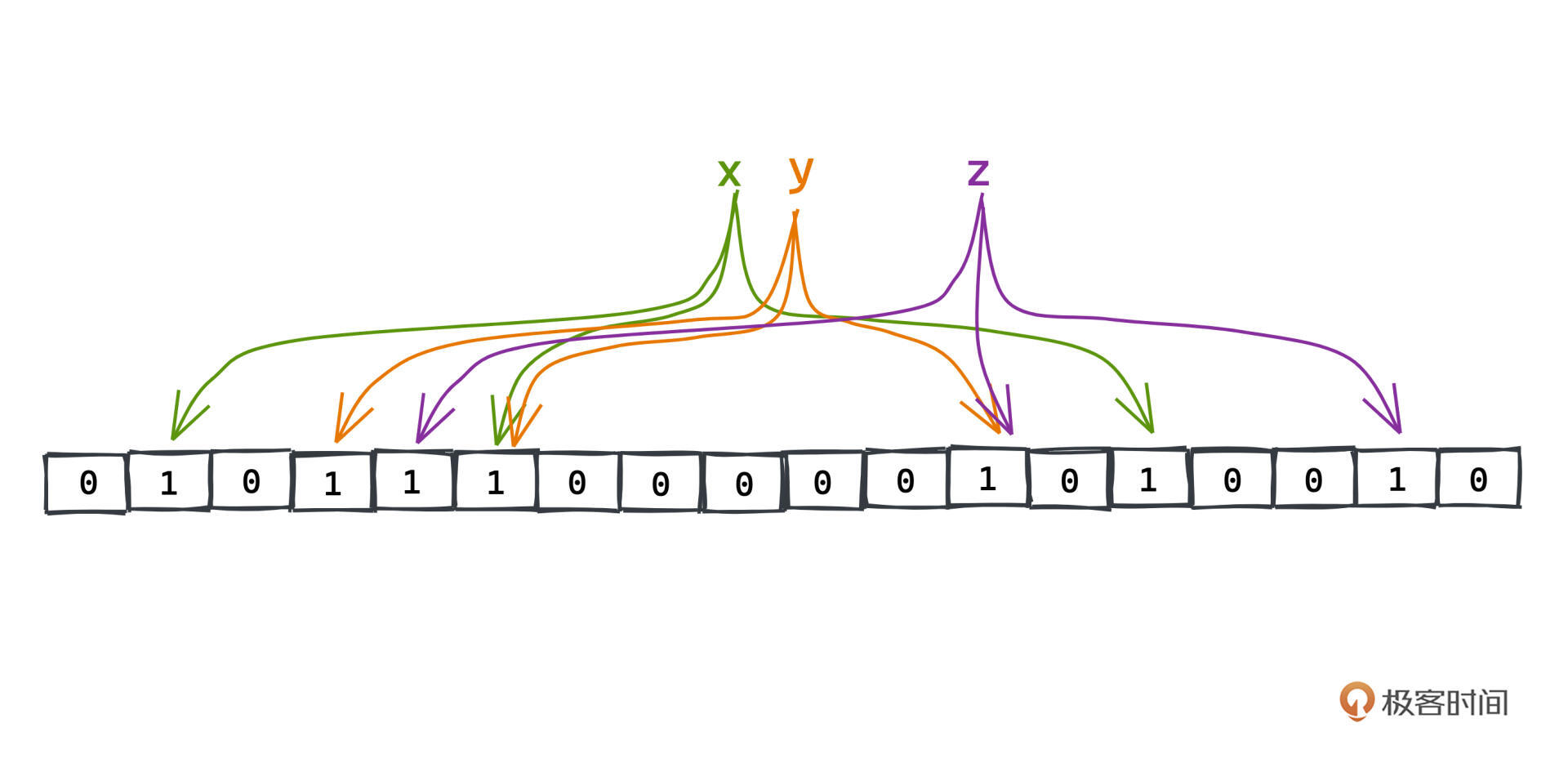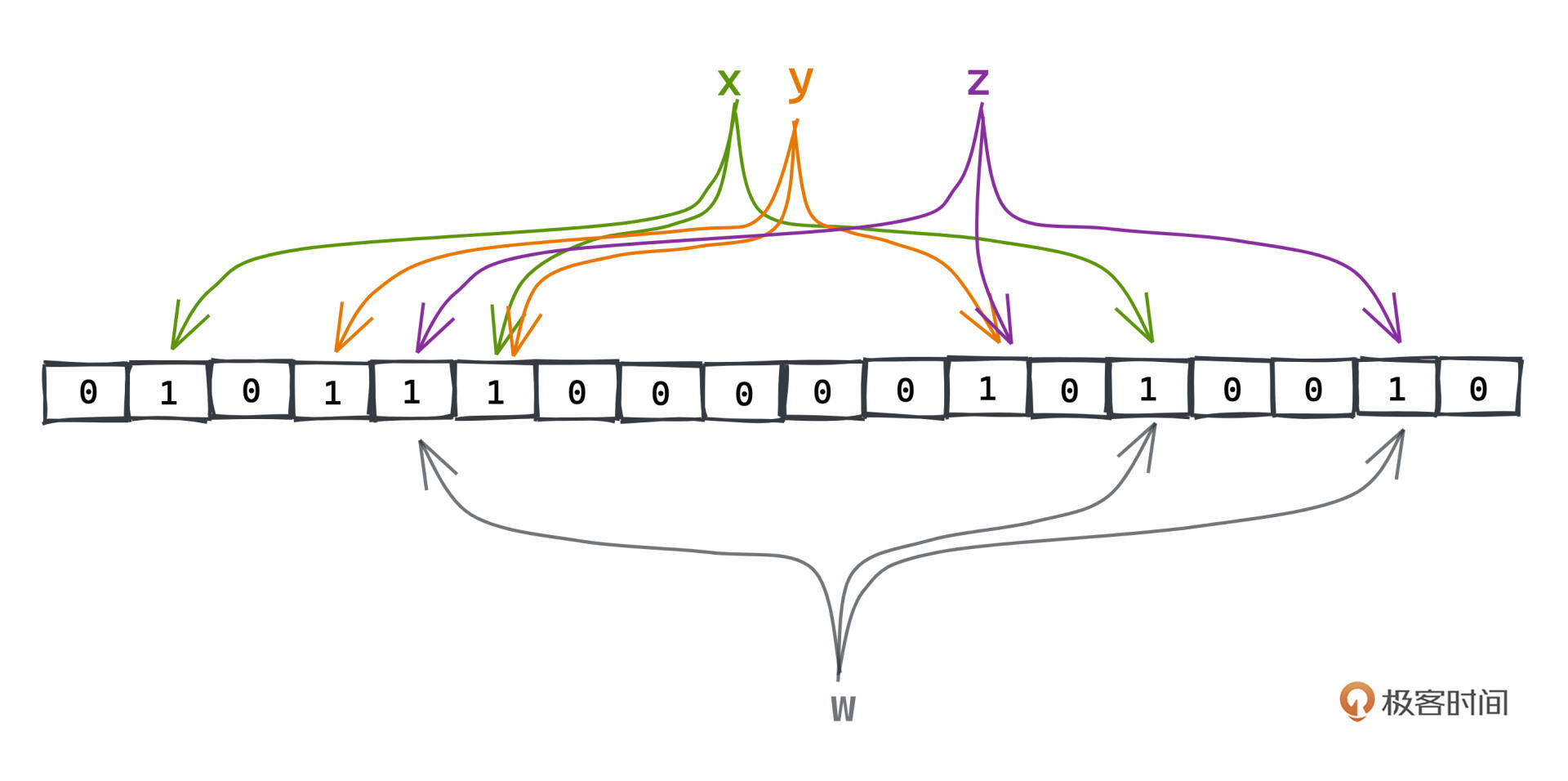 上一讲我们学习了如何基于bitmap,使用少量内存,对大量密集数据高效地去重和排序,本质就是通过一个长长的二进制01序列,来维护每个元素是否出现过这样的二值状态,这个数据结构非常重要,日常工作中有很多应用,比如我们今天要学习的布隆过滤器,就建立在相似的数据结构之上。