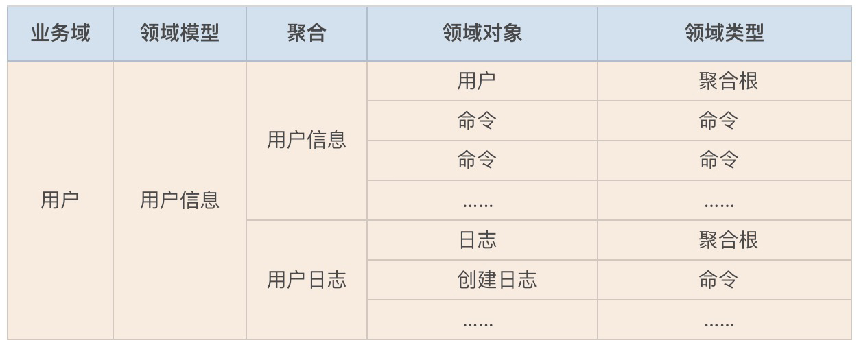 到这里我们就完成了用户中台领域模型的构建了。那由于领域建模的过程中产生的领域对象实在太多了,我们可以借助表格来记录。