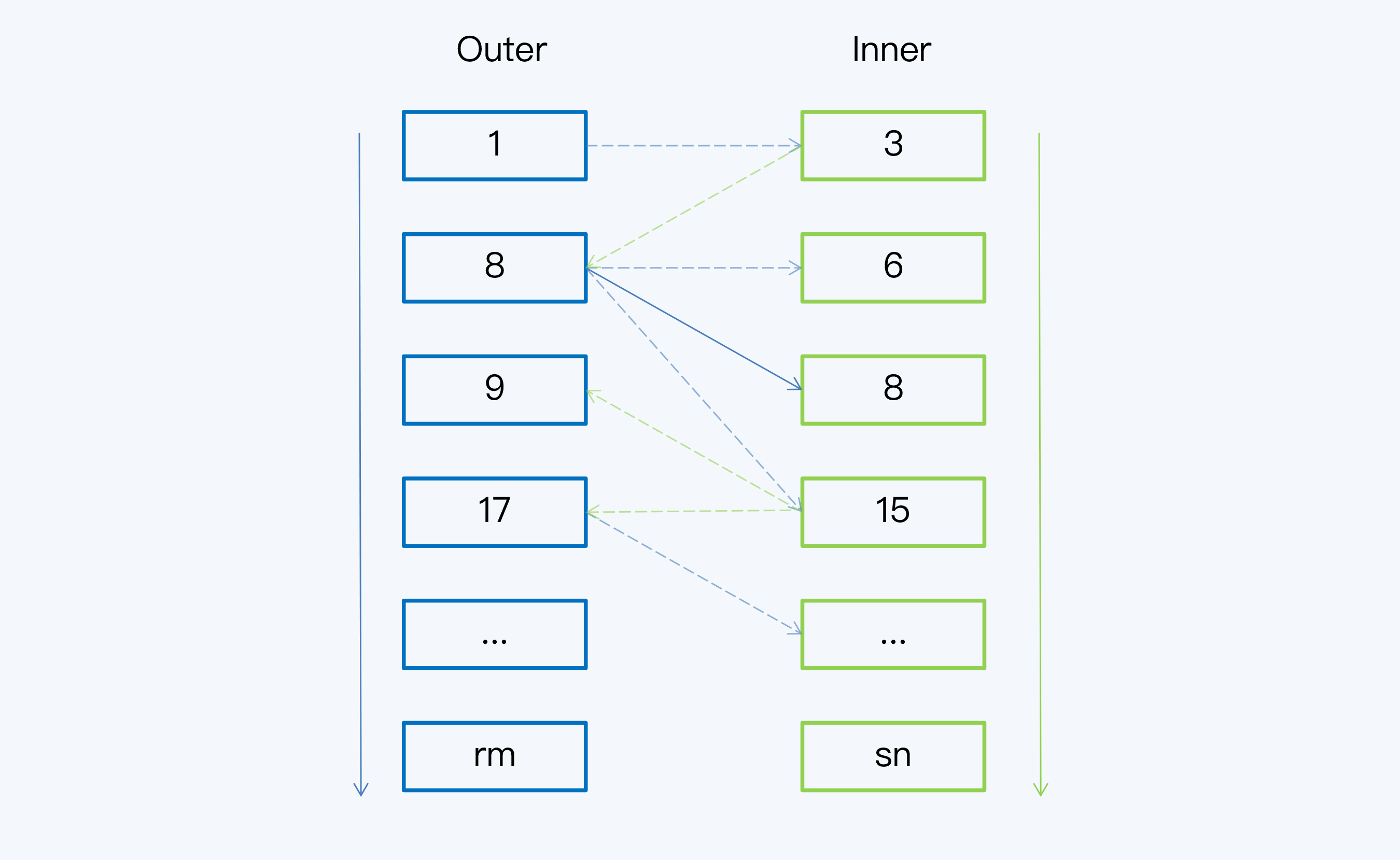 - 通过连接键(Join Key)和ri可以确定对Inner表索引的扫描范围,再通过索引得到对应的若干条数据记录,记为sj;