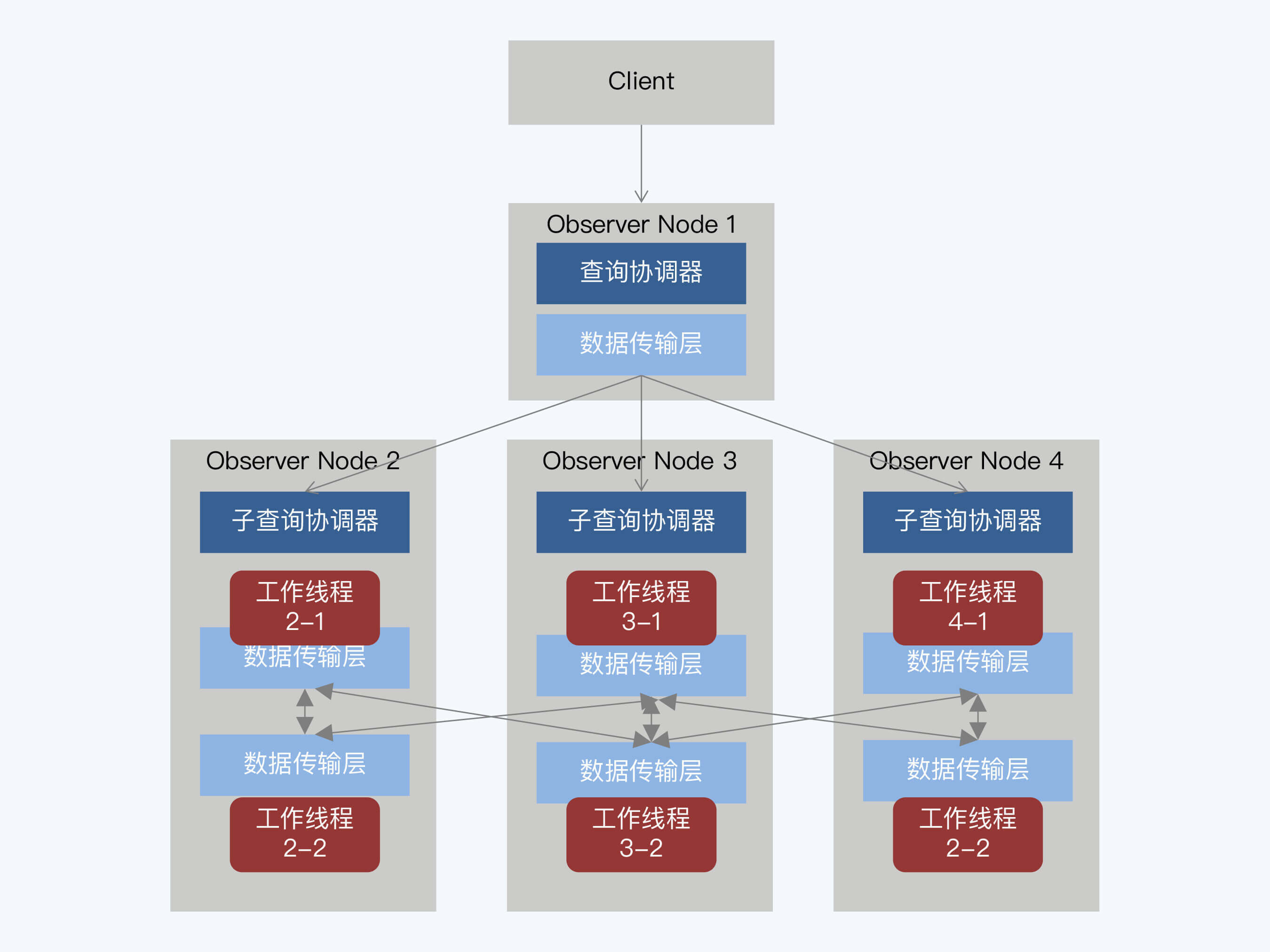 OceanBase大致也是P2P架构,每个Observer部署了相同的服务,在运行过程中,动态的承担不同角色。图中一个Observer节点承担了入口处的查询协调器,其他节点作为子查询协调器,上面的工作线程是真正的任务执行者。