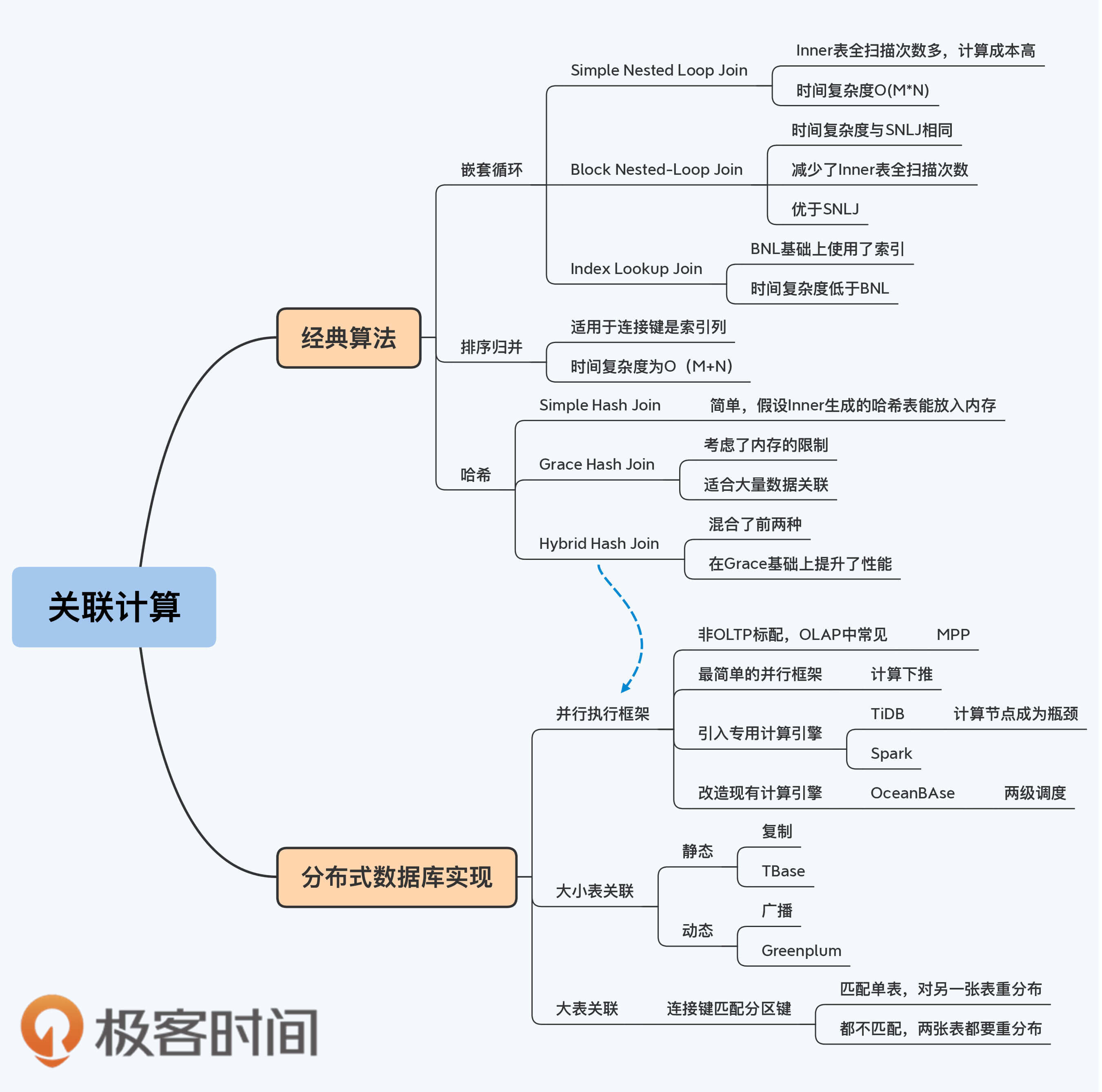 关联算法作为一个稍微细节点的设计,在不同数据库中是有差异的,我们还是秉承课程的整体思路,不陷入具体的设置参数、指令等内容。这样安排的依据是,只要你掌握关联算法的基本原理,就能快速掌握具体数据库的实现了。同时,有了这些原理作为基础,你也能更容易地掌握分布式数据库的优化思路。