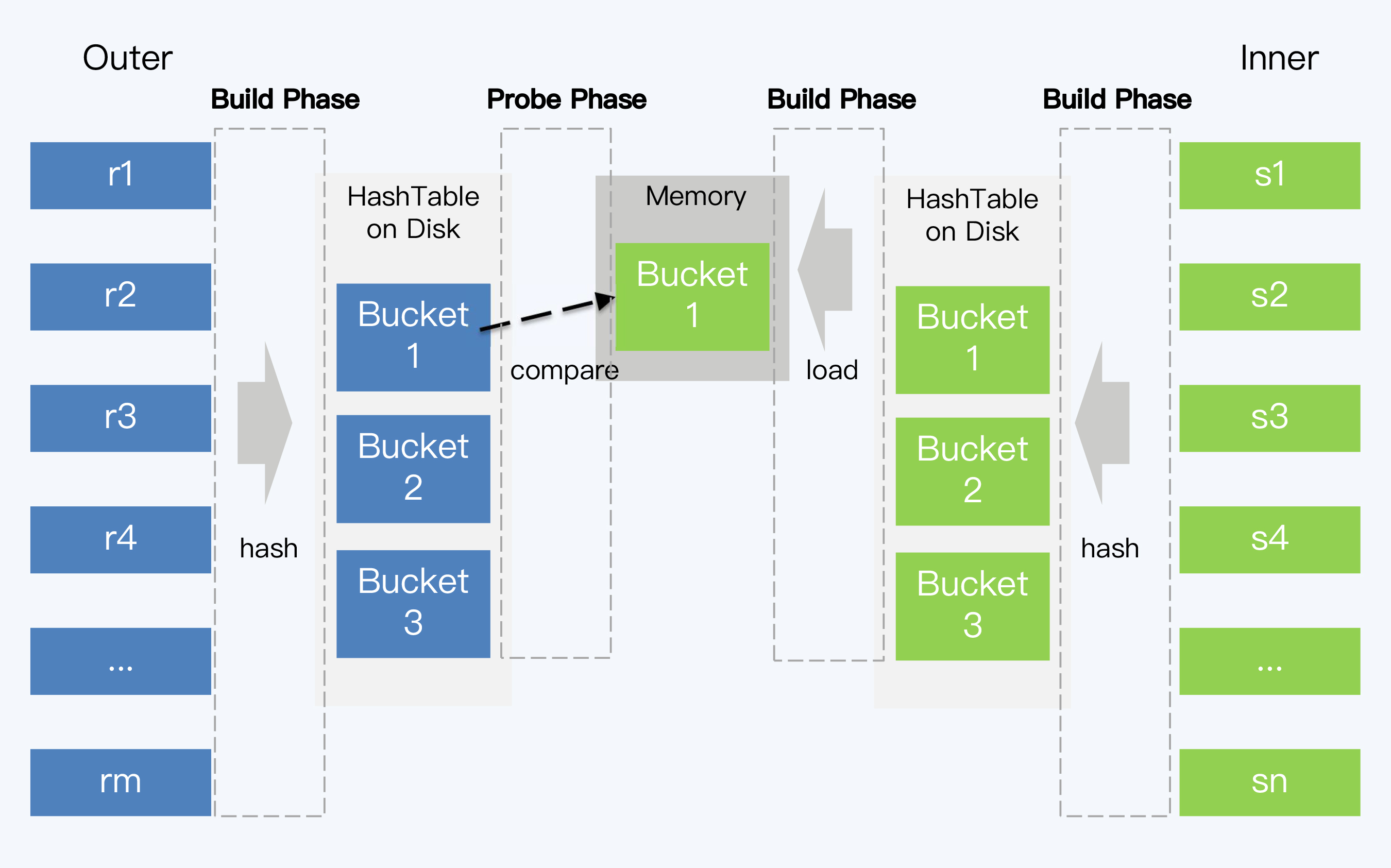 第二阶段和SHJ类似,先将Inner表的Bucket加载到内存,再读取Outer表对应Bucket的记录进行匹配,所有Inner表和Outer表的Bucket都读取完毕后,就得到了最终的结果集。