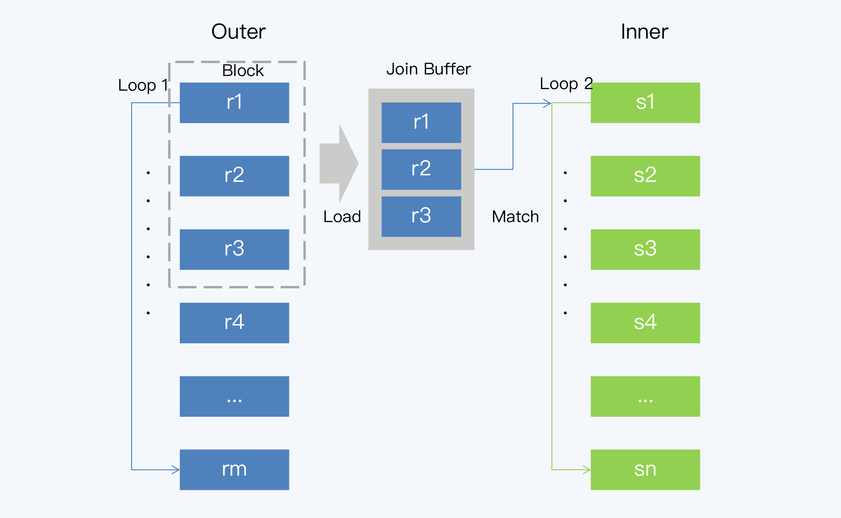 - 遍历 Inner 表,对于 Inner 表中的每条记录,与r1做join操作并输出结果;