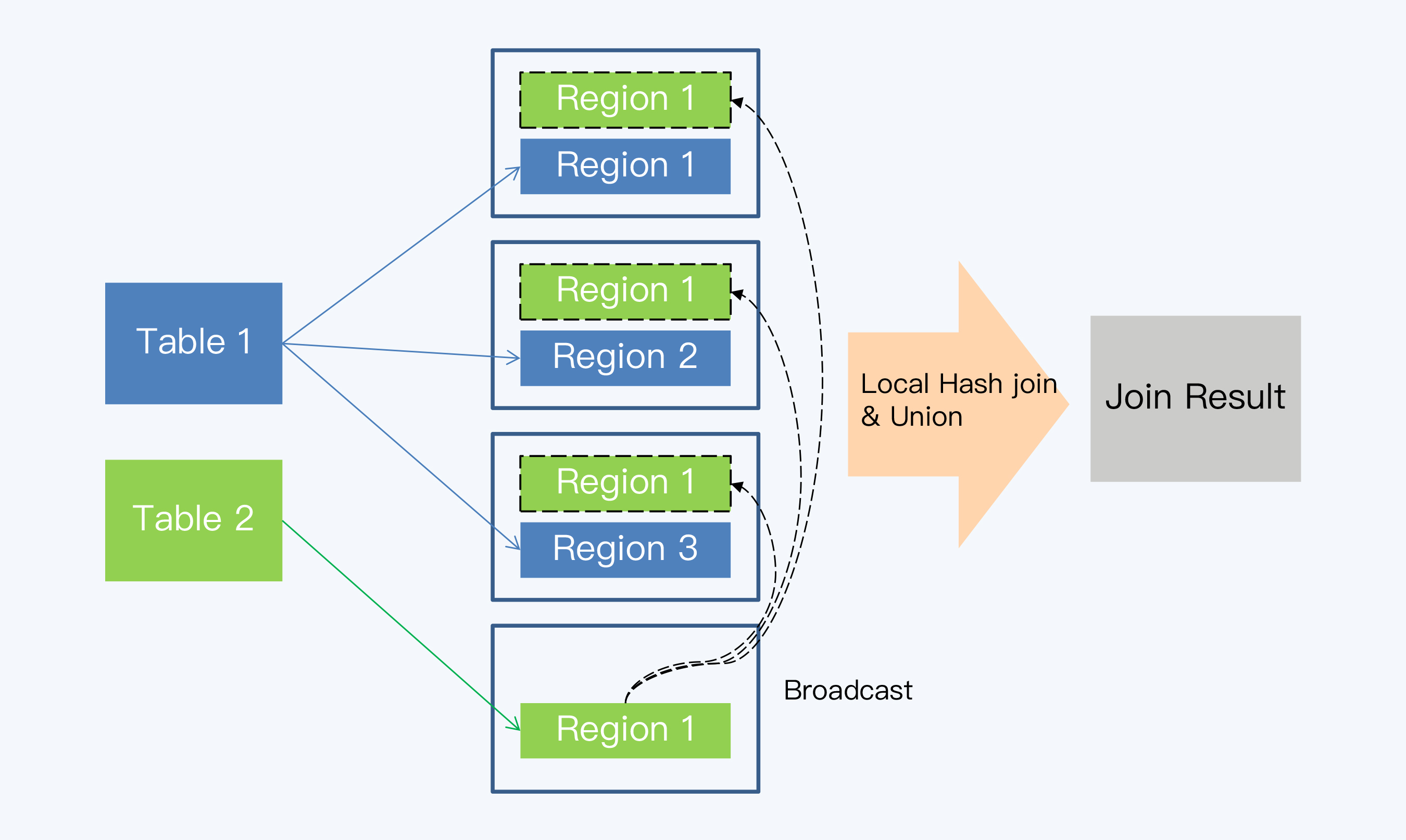 动态方式也称为“小表广播”,这种方式不需要人工预先定义,而是在关联发生时,系统自行处理。这就是说,当关联的某张表足够小时,在整个集群中分发不会带来太大的网络开销,系统就将其即时地复制到相关的数据节点上,实现本地关联。