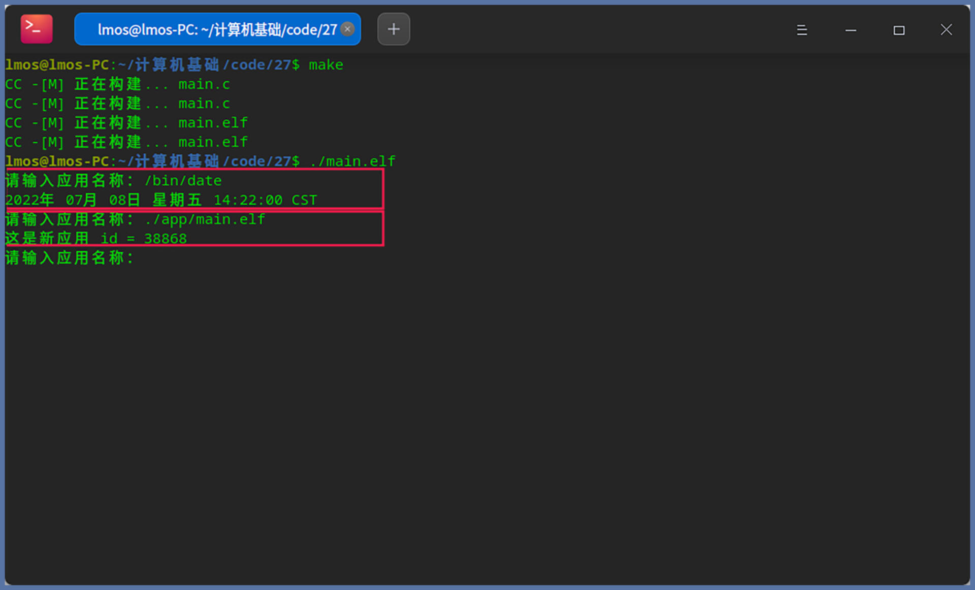对照截图,我来说明一下验证过程。首先执行make编译,然后加载我们的shell。第一次我们使用系统中的date命令进行测试,该命令会输出当前日期和时间。我们看到,上图中显示的是正确的;第二次我们使用自己的应用测试,如上图中的输出,正是我们应用程序运行之后的结果。