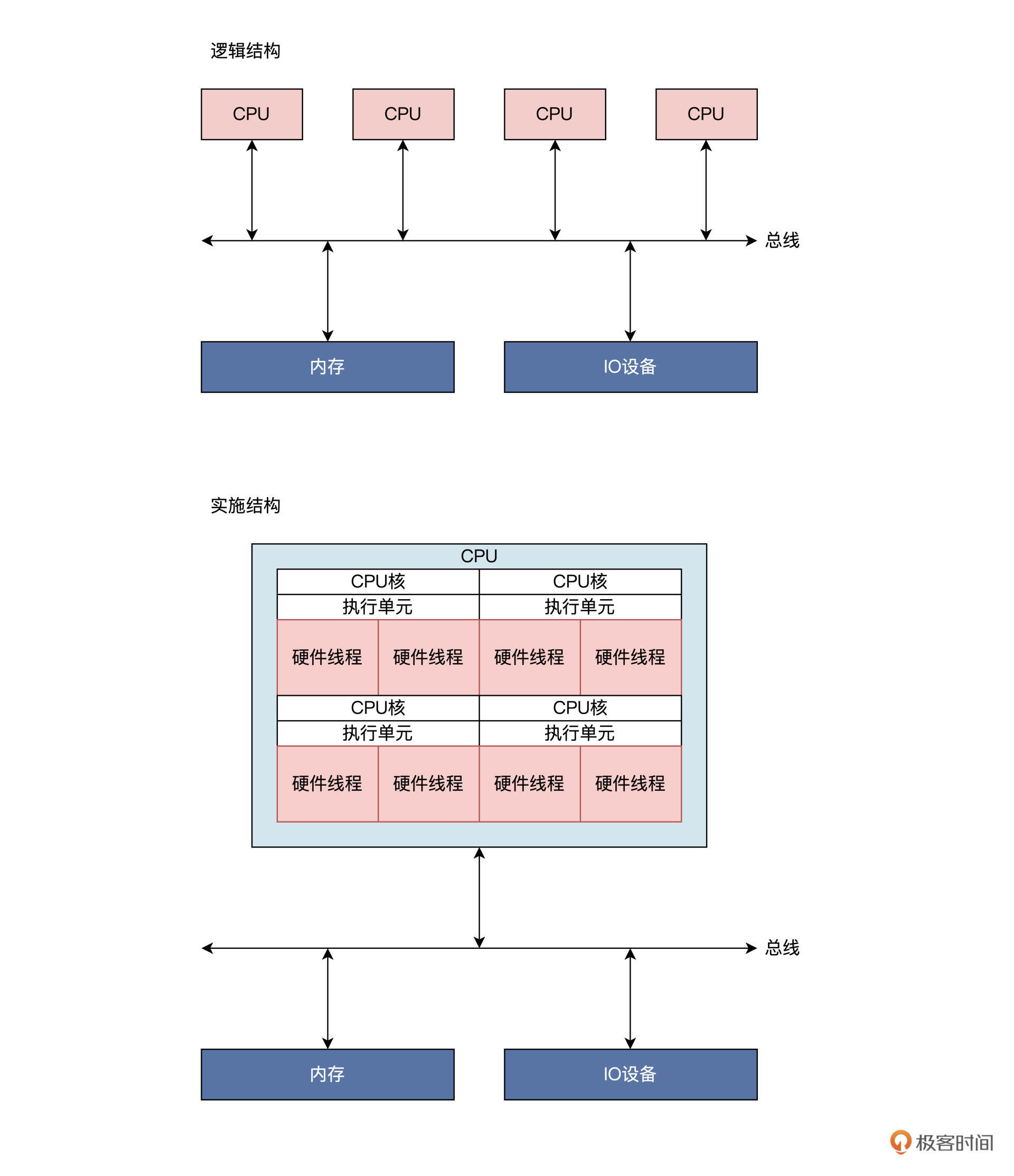 我画的是典型的4核8线程CPU结构,请注意上图中的实施结构,更接近于真实的情况。一个芯片上封装了四个CPU内核,每个CPU内核都有具有相同功能的执行单元;在一个执行单元上实现了两个硬件线程,这里硬件线程就是一套独立的寄存器,由执行单元调度,就像是操作系统调度进程。只是这里由硬件完成,软件开发人员不知道,操作系统开发者只感觉到这是一颗逻辑CPU,可以用来执行程序。