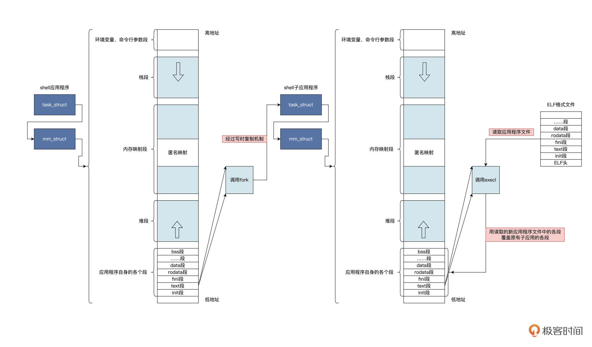 shell的机制里只用到了两个系统调用——fork和execl,我给你画了一张示意图展示其中的逻辑: