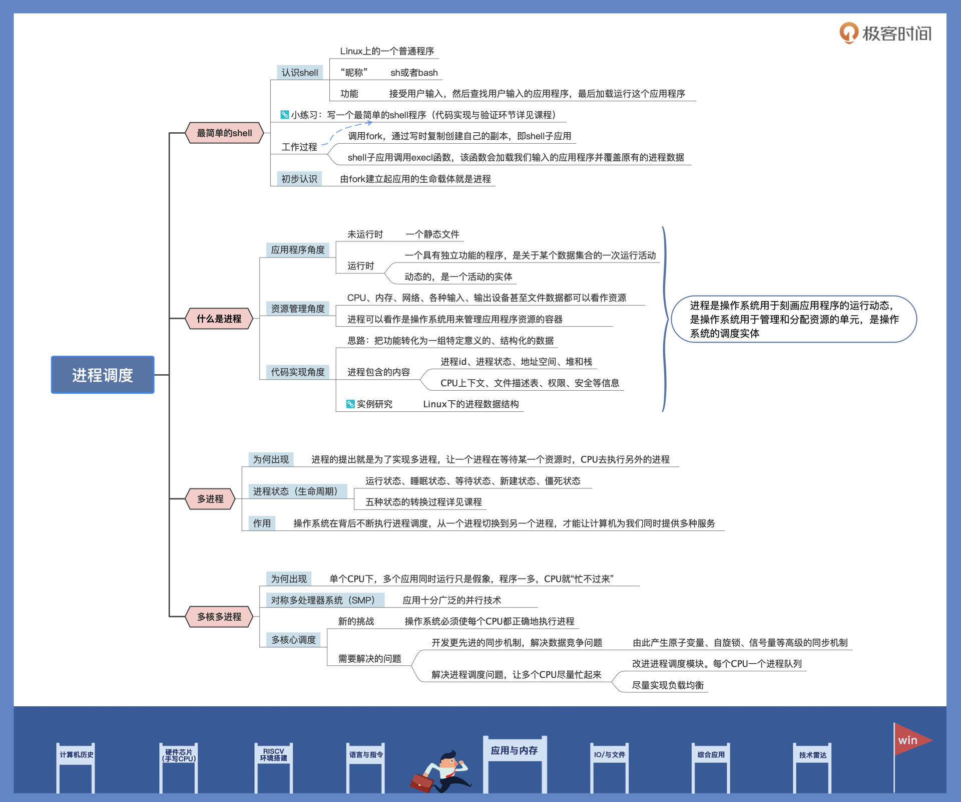 这节课我们来一起探索前面这两个问题的答案。我会带你先从最简单的shell开始,了解一个应用的运行过程,然后和你聊聊进程的本质,以及它的“生老病死”,最后再给你讲讲多进程调度是怎么回事儿。