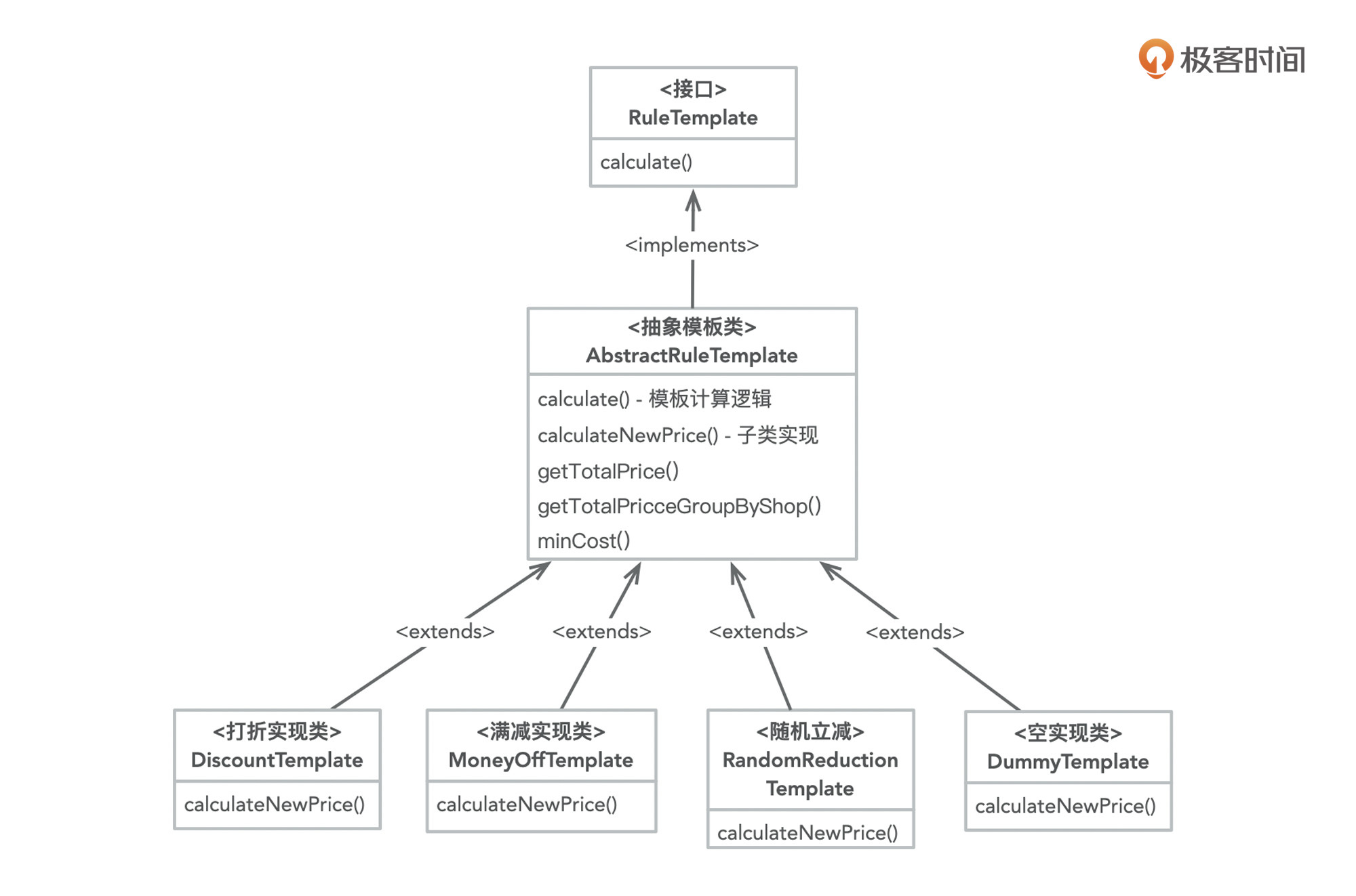 在这张图里,顶层接口RuleTemplate定义了calculate方法,抽象模板类AbstractRuleTemplate将通用的模板计算逻辑在calculate方法中实现,同时它还定义了一个抽象方法calculateNewPrice作为子类的扩展点。各个具体的优惠计算类通过继承AbstractRuleTemplate,并实现calculateNewPrice来编写自己的优惠计算方式。