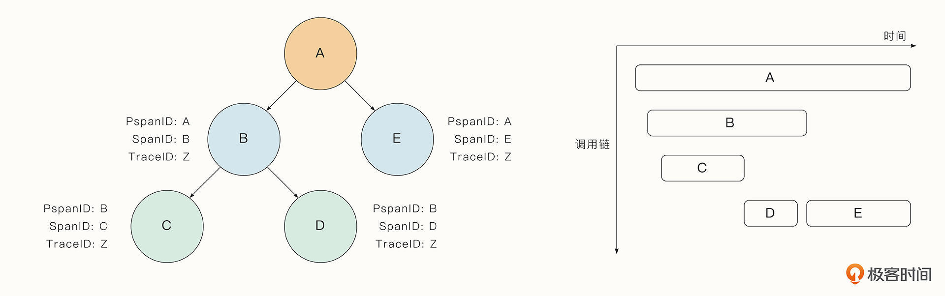 每一个span中还保存了当前调用链唯一的traceID,当前span的ID、以及父span的ID。当**函数调用或跨服务传递时,服务会传递span的这些上下文信息,以便跟踪span之间的调用链关系。**如下图左侧是服务调用链构成的一个有向无环图,有些分布式追踪组件可以通过瀑布图的形式显示出在调用链中每个span的耗时,如下图右侧看到的,这种可视化的手段能直观地反应调用链的耗时情况。