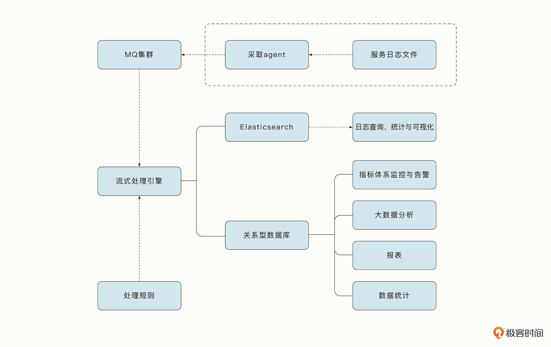目前业内通用的做法是借助一个agent服务(典型的工具有Flume、Filebeat、Logstash、Scribe),监听并增量采集日志数据到消息中间件,下游计算引擎会实时处理数据,并把数据存储到对应的数据库做进一步处理。典型的日志采集与监控链路如下所示: