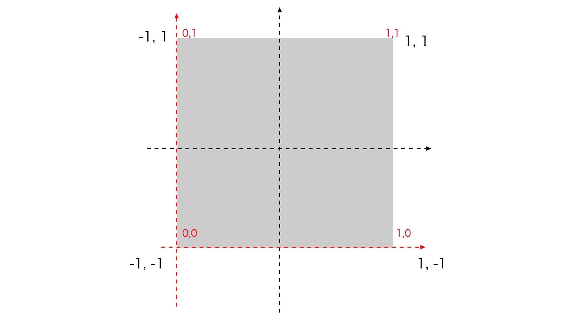 在上面的代码中,我们一共设置了三个数据。首先,我们设置了positions也就是顶点。这里我们一共设置了四个顶点,这四个顶点坐标正好覆盖了整个Canvas画布。接着是uv,也就是纹理坐标。它和纹理设置有关,不过你先不用理解什么是纹理设置,只要知道这个坐标系的左下角为0,0,右上角为1,1就可以了。