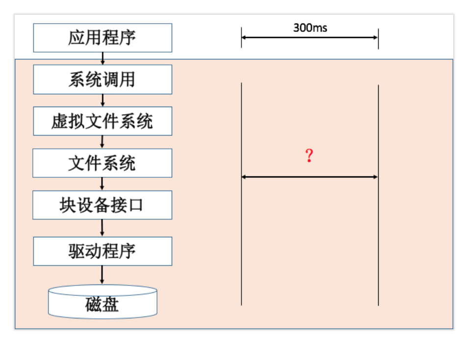 正如下图你所看到的,整个I/O的流程涉及的链路非常长。我们在应用程序中通过打点,发现一个文件读取需要300ms。但是下面每一层可能都有自己的策略和调度算法,因此很难真正的得到每一层的耗时。