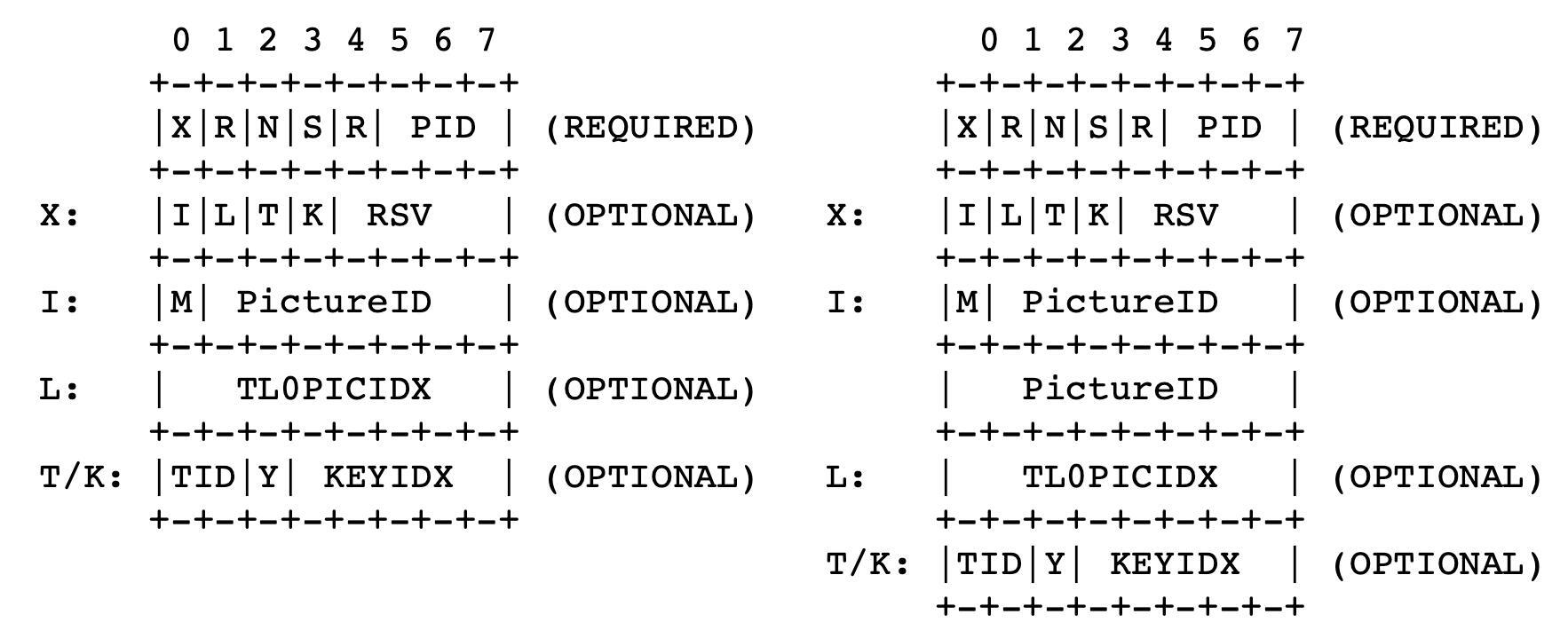 这里我们可以参考VP8编码的RTP协议标准。**VP8的RTP协议在RTP头和VP8码流数据的中间还有一个RTP描述头,这个描述头主要用来放帧号、层号等信息的。**具体如下图所示:
