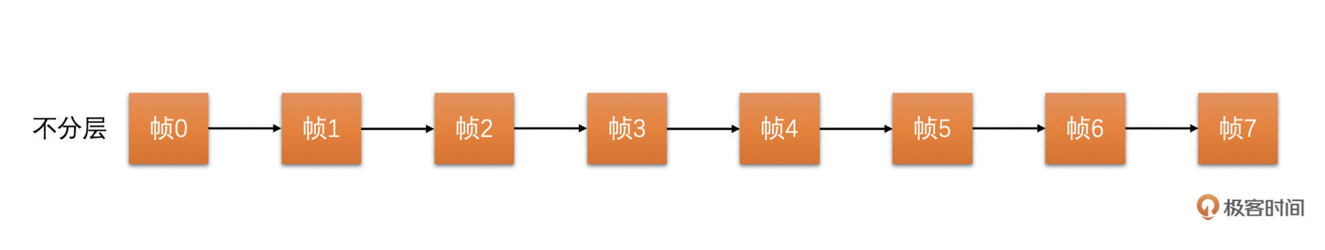 帧率上做SVC是什么意思呢?我们在前面的课中讲过,一般我们在RTC场景中选择使用连续参考的参考结构来做编码。如下图所示: