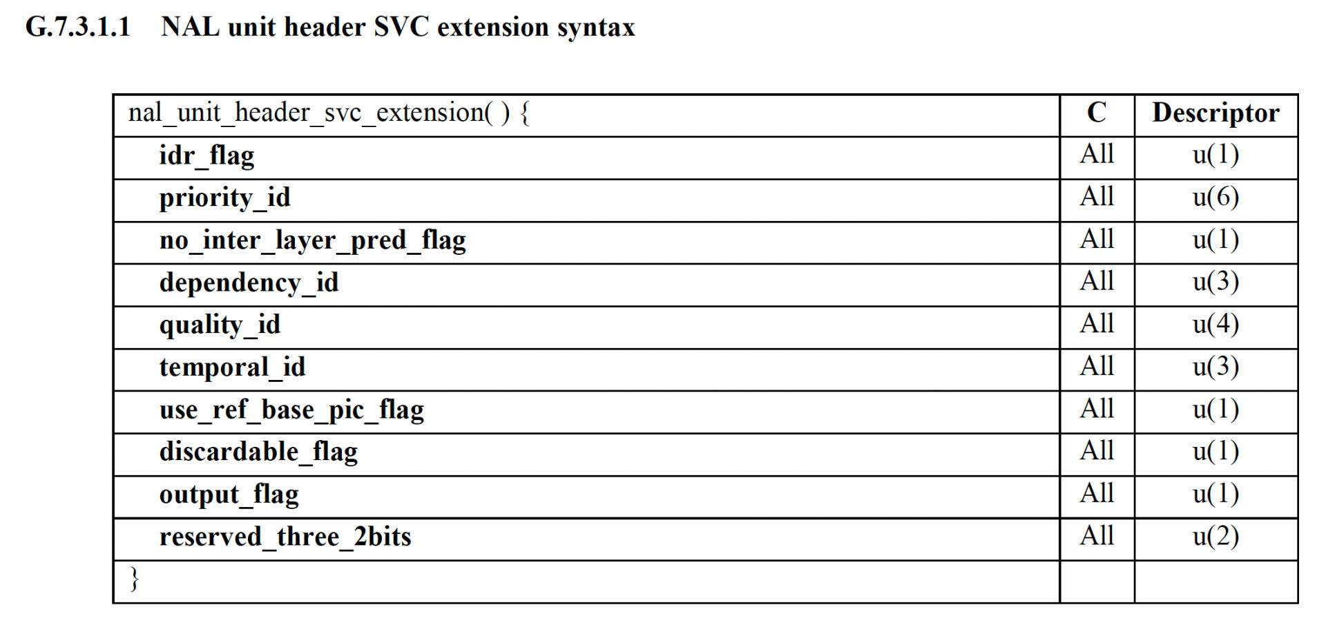 上面是VP8的时域SVC的RTP协议。那H264呢?H264其实在标准的附录G直接定义了SVC的相关字段,也就是说在H264的编码码流里面就可以有SVC信息。如下图所示: