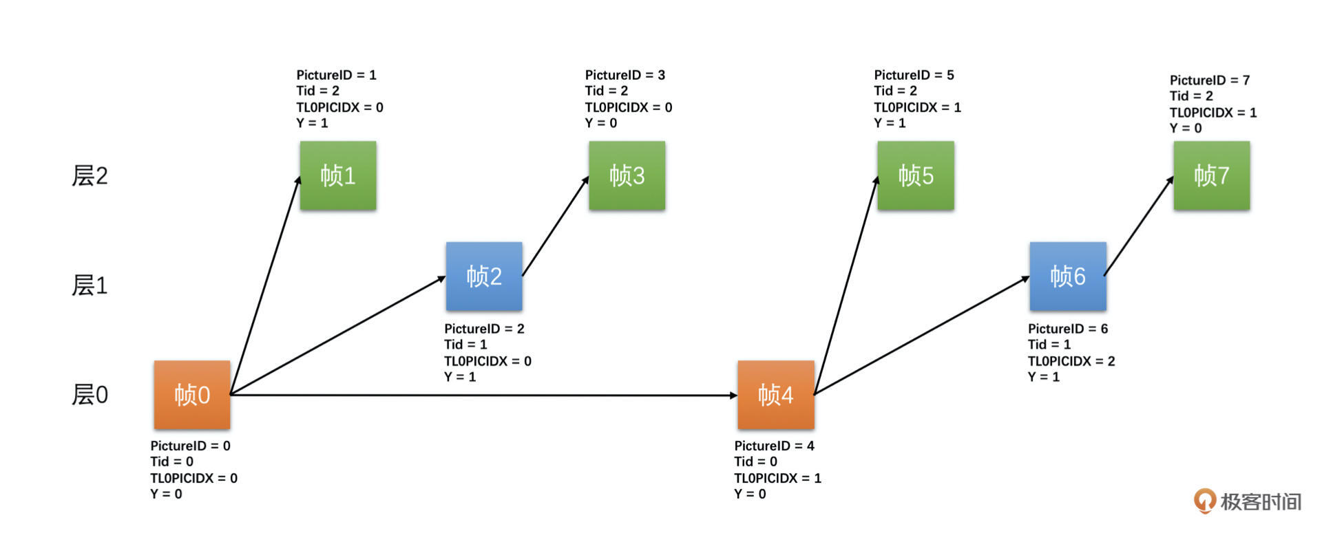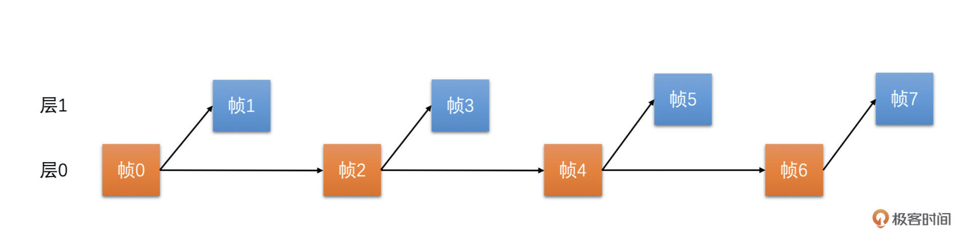 在图中,帧0是I帧不需要参考,且是第0层的帧。帧1是P帧,参考帧0,且是第1层的帧。帧2是P帧,参考帧0,不参考帧1,是第0层的帧。帧3是P帧,参考帧2,是第1层的帧。一直用这种模式不断地循环下去。