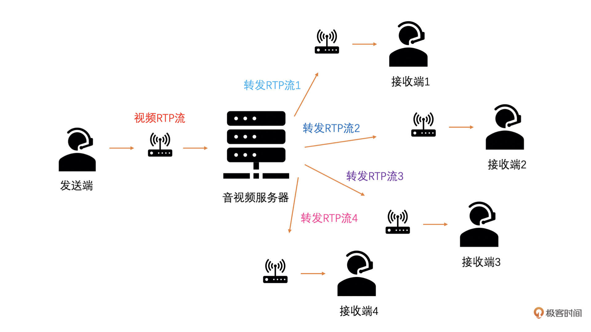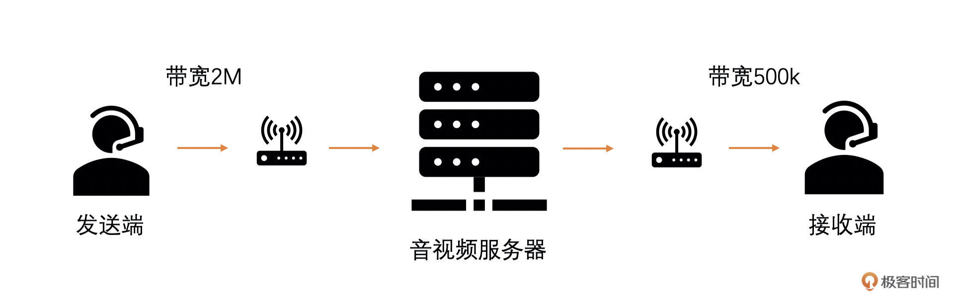 比如说,我和你两个人进行视频通话,我是发送端,网络非常好,你是接收端,网络比较差。发送端和接收端之间的视频通路如下图所示: