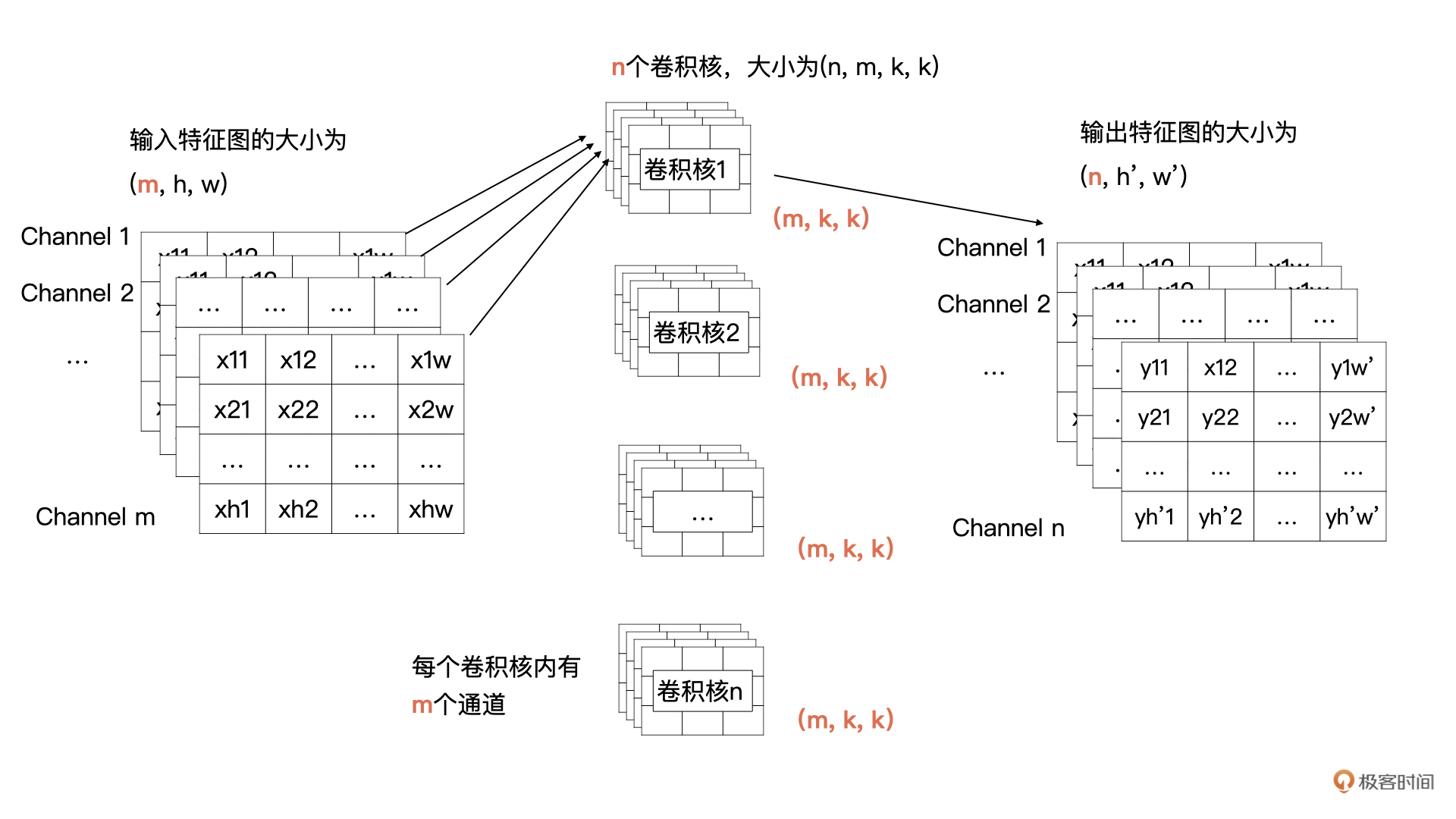 卷积的计算方式是你需要关注的重点。具体过程如下图所示,输出特征图的通道数由卷积核的个数决定的,下图中因为有n个卷积核,所以输出特征图的通道数为n。输入特征图有m个通道,所以每个卷积核里要也要有m个通道。