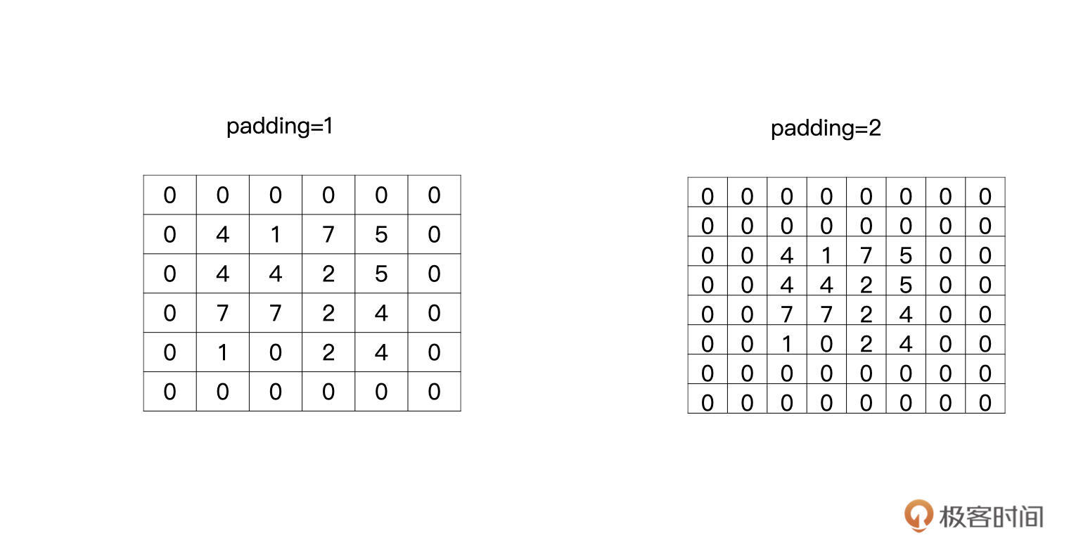 这个补零的操作就叫做padding,padding等于1就是补一圈的零,等于2就是补两圈的零,如下图所示: