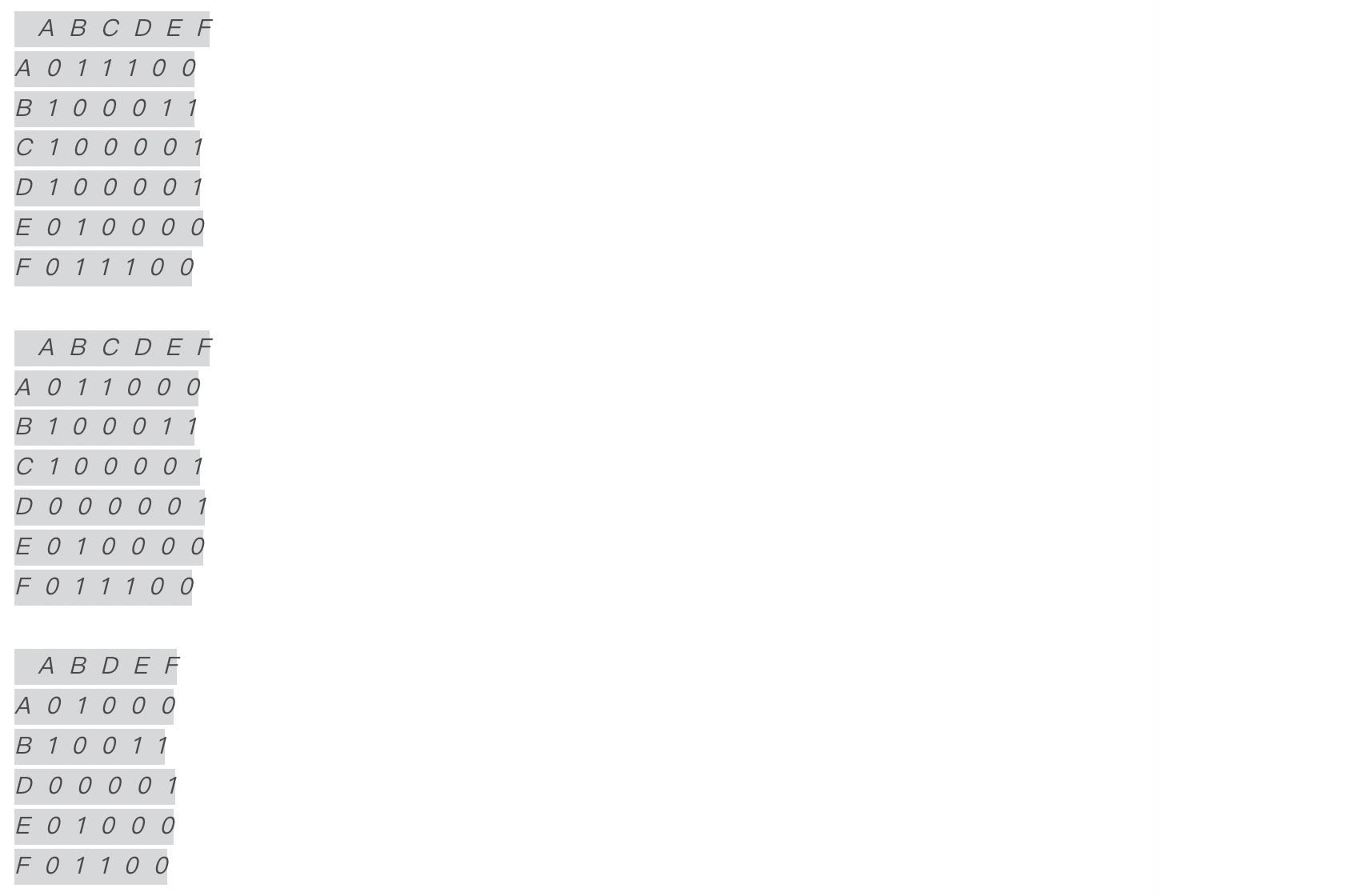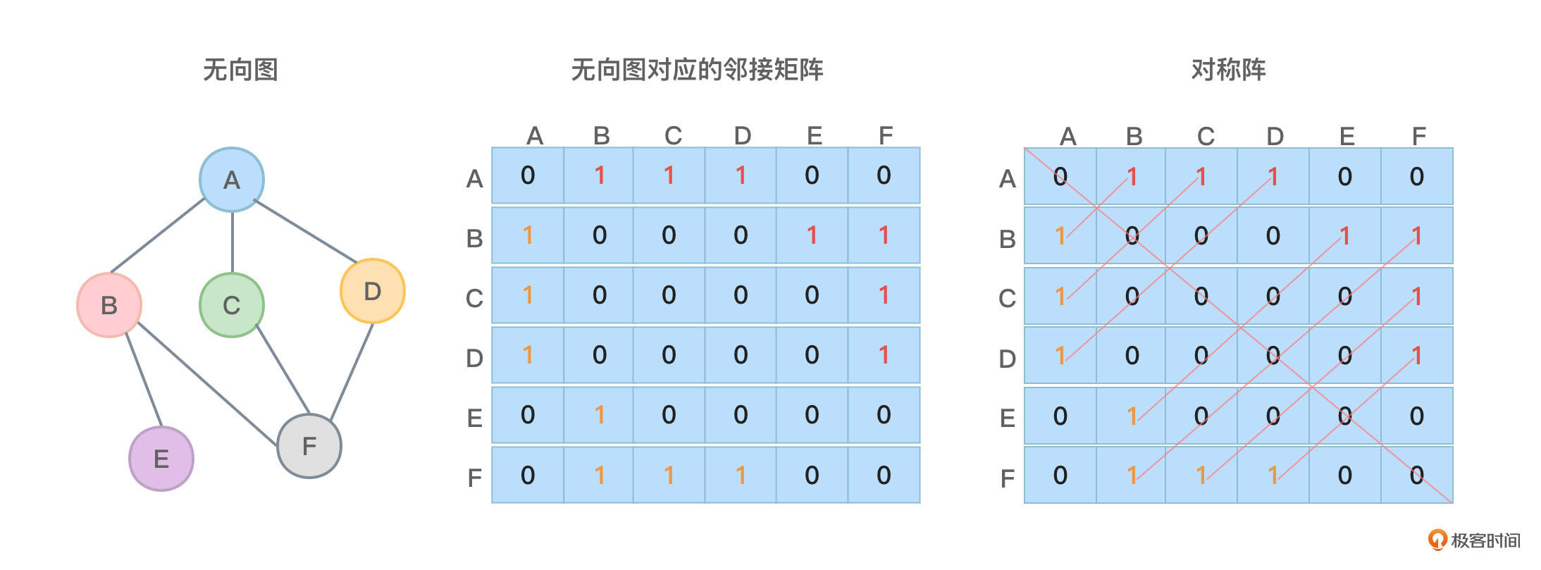 仔细观察,在图1中间的图中,横向和纵向分别由A、B、C、D、E、F这6个顶点组成一个二维数组(矩阵)。该二维数组一共由36个格组成,如果两个顶点之间有边,则该格子中标记为1,否则标记为0。比如顶点A和B之间有连线,则A和B之间交叉对应的格子中标记1,而这必然也代表顶点B和A之间有连线,所以B和A之间交叉对应的格子中也会标记1。