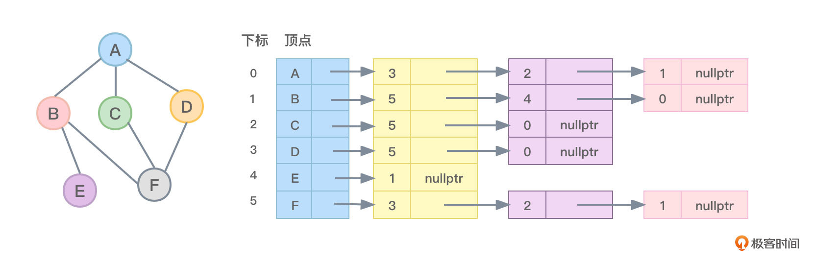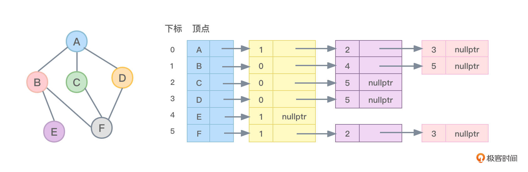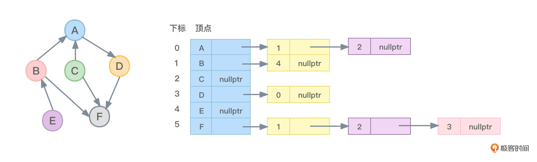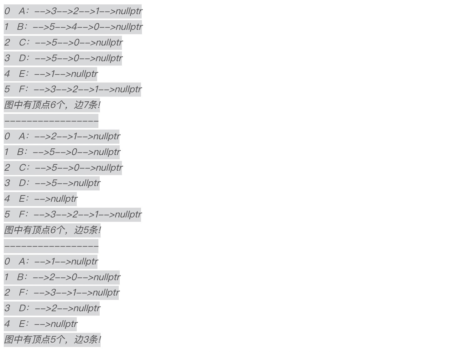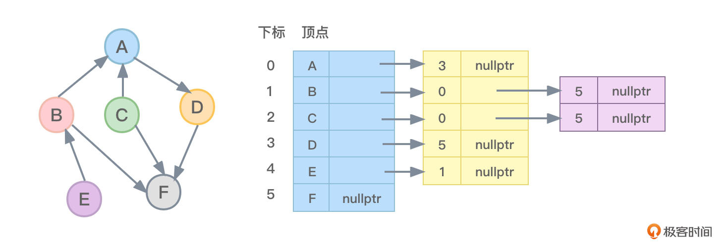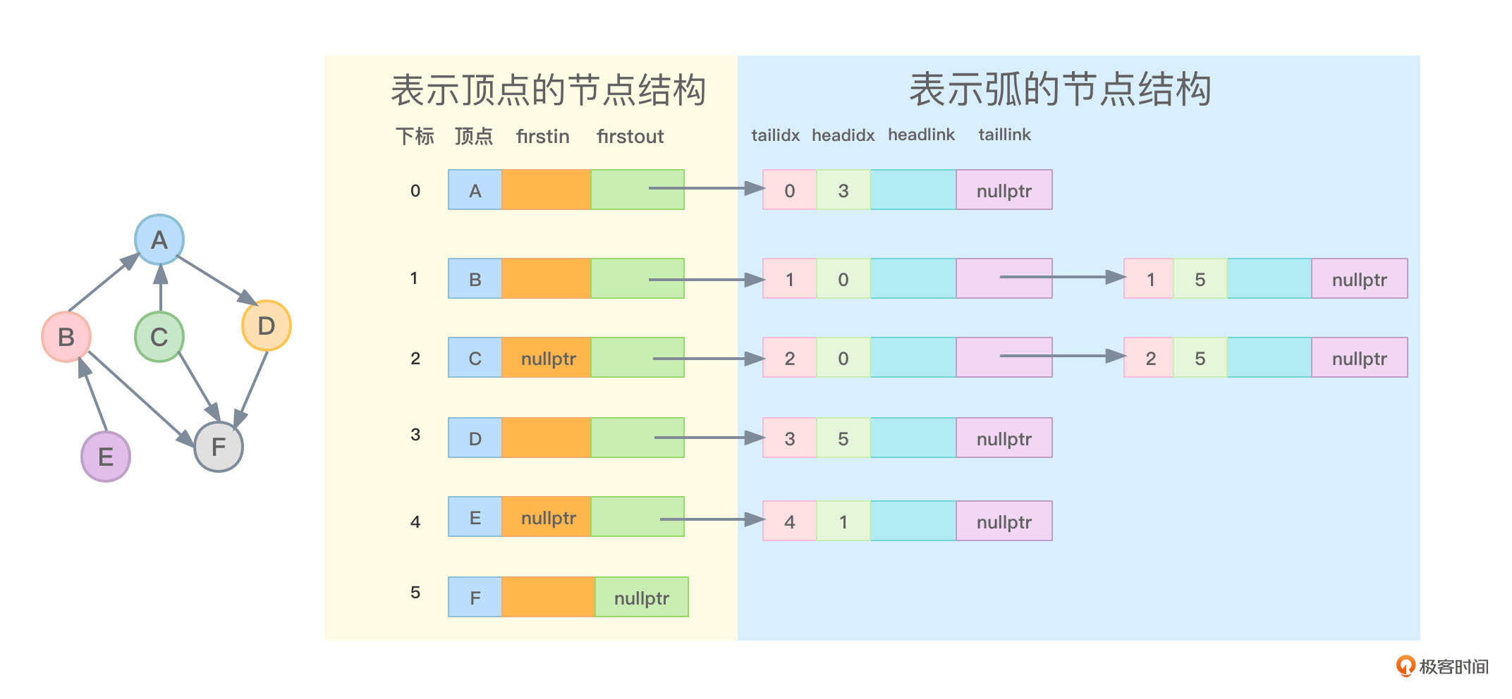 - 对于顶点F,没有指向任何弧,因此顶点F的firstout指针指向为nullptr。