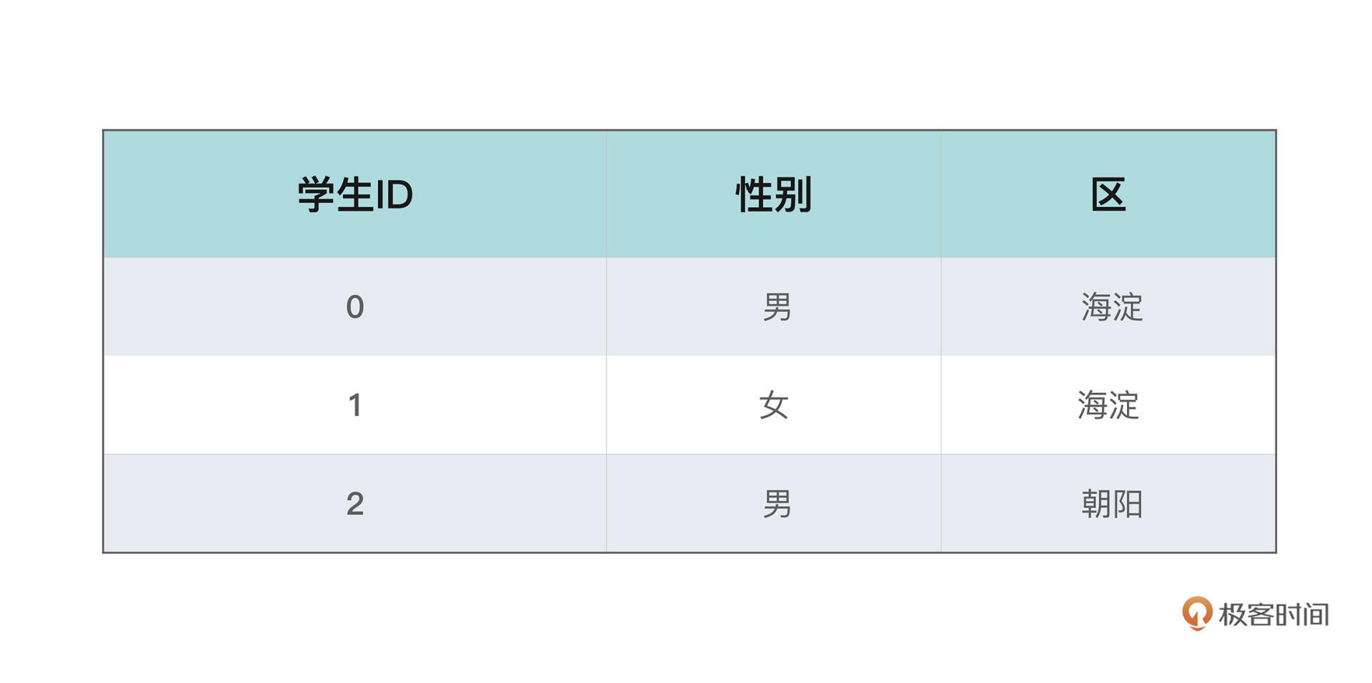 现在我们有一张北京市某所学校的学生信息表,其中有两列,分别记录了性别和所在区,这两列显然都属于有固定枚举值的情况。这里为了讲解方便,我们简单假设所包含的区只有海淀、朝阳、东城、西城这四个。