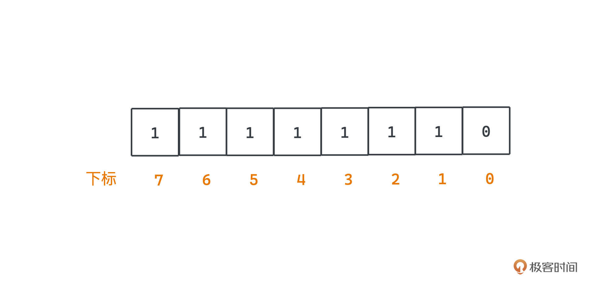 比如可以用char类型来存储8个不同元素是否出现的情况,char的范围在各大主流语言中一般为0~255,一共包含8位二进制,我们可以用下标的每一位来表示一个元素是否出现。在这张图中Bitmap的值为254,表示下标1~7的元素都有出现,而下标0的元素没有出现。
