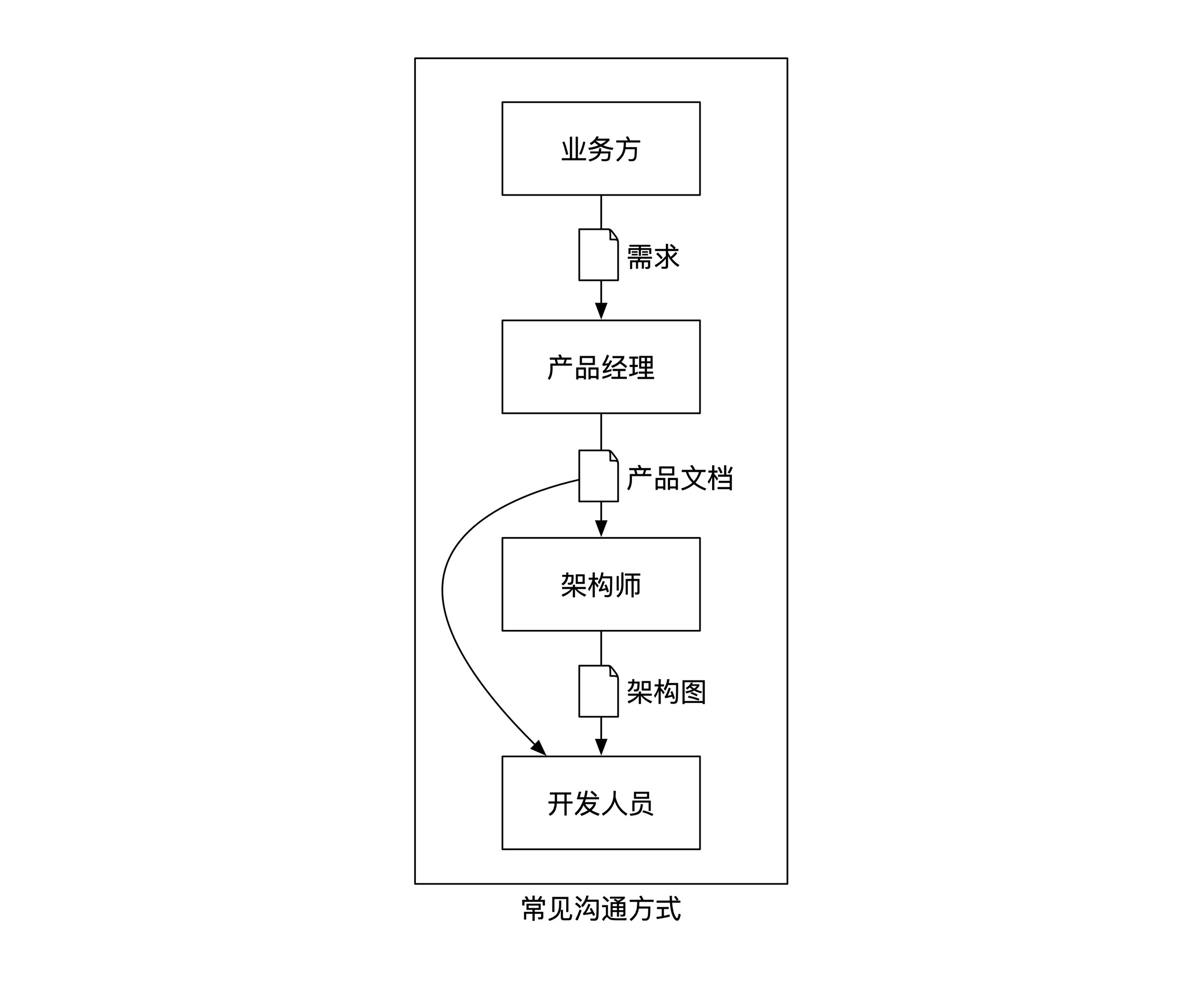 这个流程看上去很好,但是在实际操作中会有一些问题。比如当开发人员发现文档细节不够全面,甚至内容有误怎么办呢?这时候,沟通只能原路返回,等产品或者业务方再次确定清楚后,再从上往下传递消息。