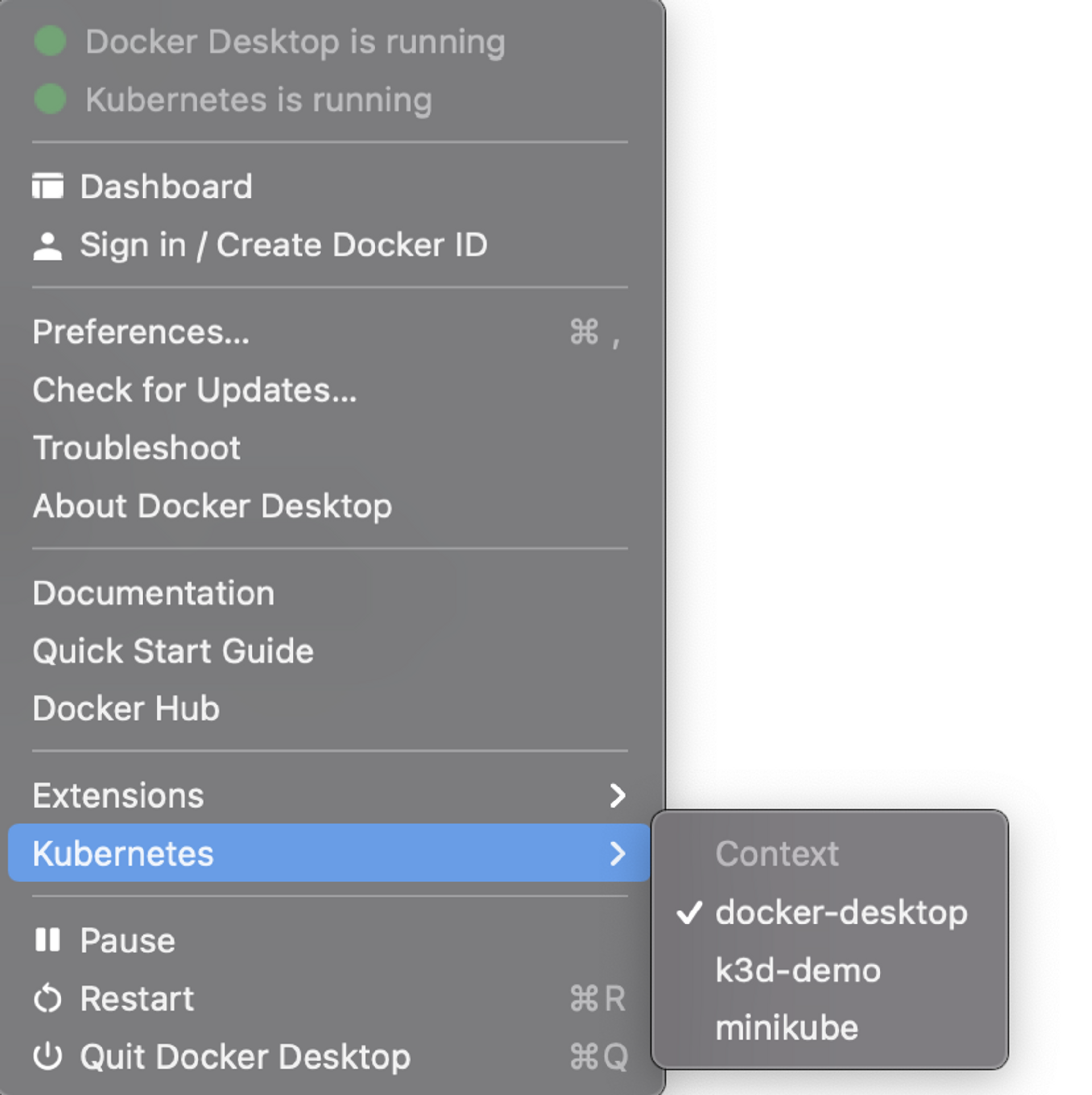 最后,Docker Desktop还提供了切换Kubernetes Context的能力,我们点击docker-desktop,这样我们通过kubectl发送的命令就会传到Docker Desktop构建的Kubernetes集群中。