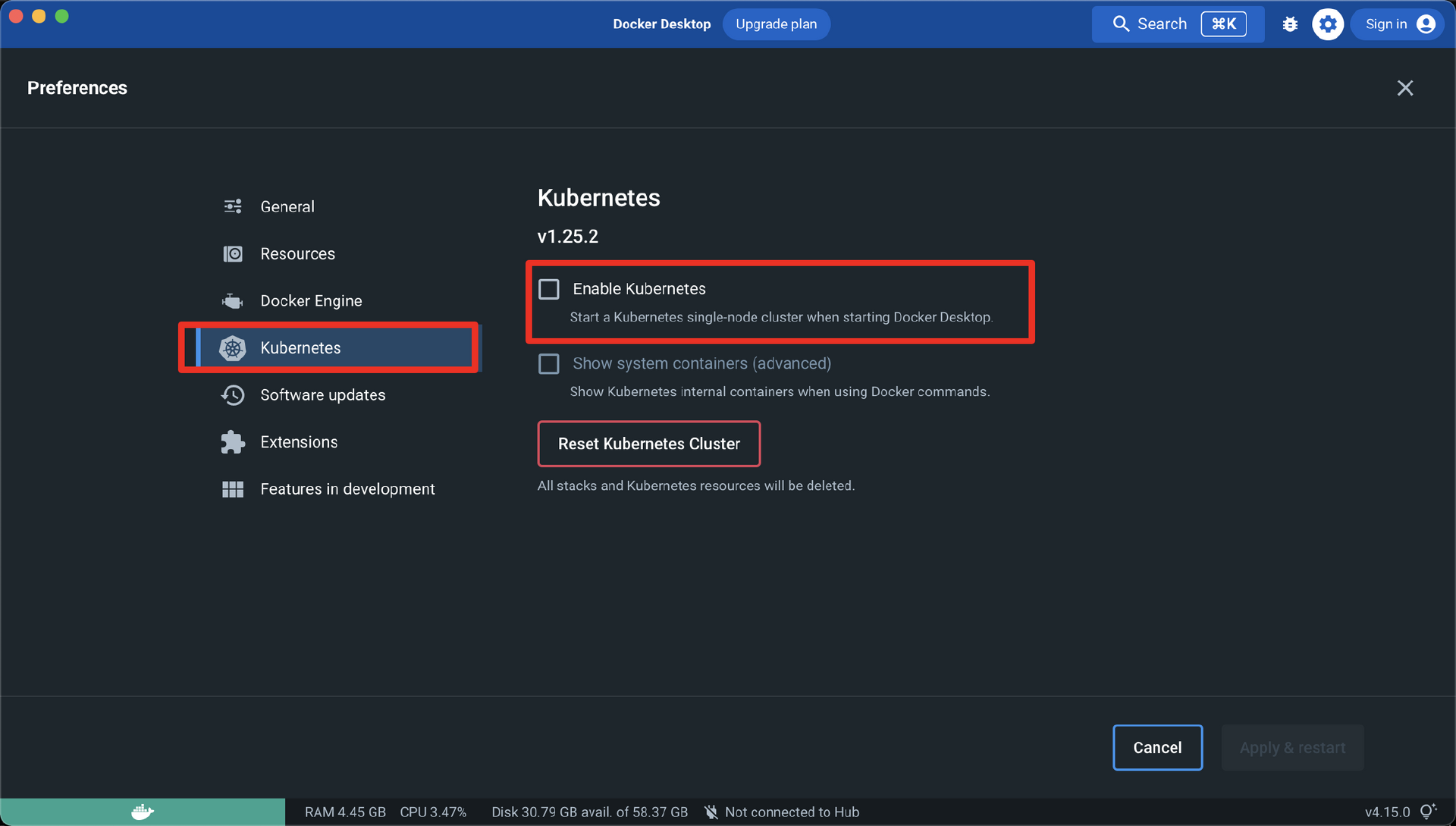 之前,我们在Windows和Mac中用Docker Desktop安装包来安装了Docker,其实利用最新的Docker Desktop,我们还可以在本地生成Kubernetes集群。使用Docker Desktop生成Kubernetes集群非常简单,我们只需要点击Docker的鲸鱼图标,并且在Preferences中勾选Enable Kubernetes,然后点击下方的Apply & restart 就可以创建我们的 Kubernetes 集群了。
