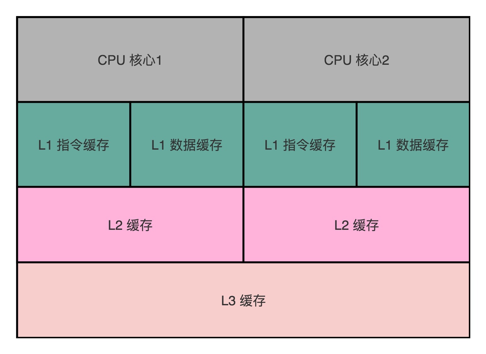 我们现在用的Intel CPU,通常都是多核的的。每一个CPU核里面,都有独立属于自己的L1、L2的Cache,然后再有多个CPU核共用的L3的Cache、主内存。
