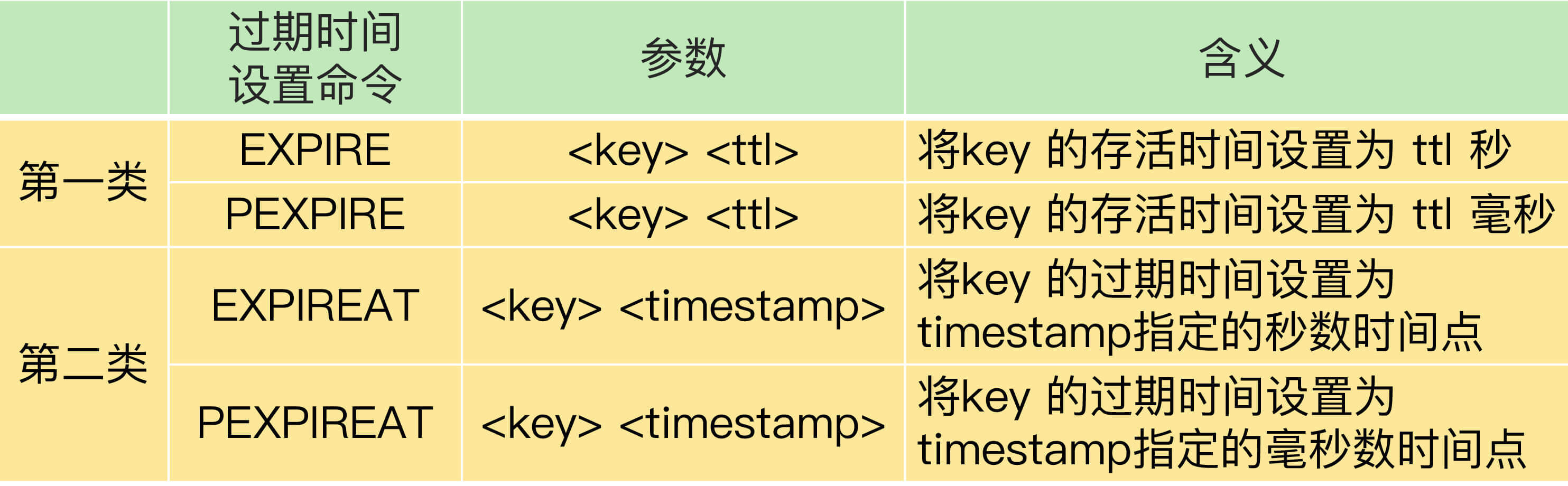 我先给你介绍下这些命令。设置数据过期时间的命令一共有4个,我们可以把它们分成两类: