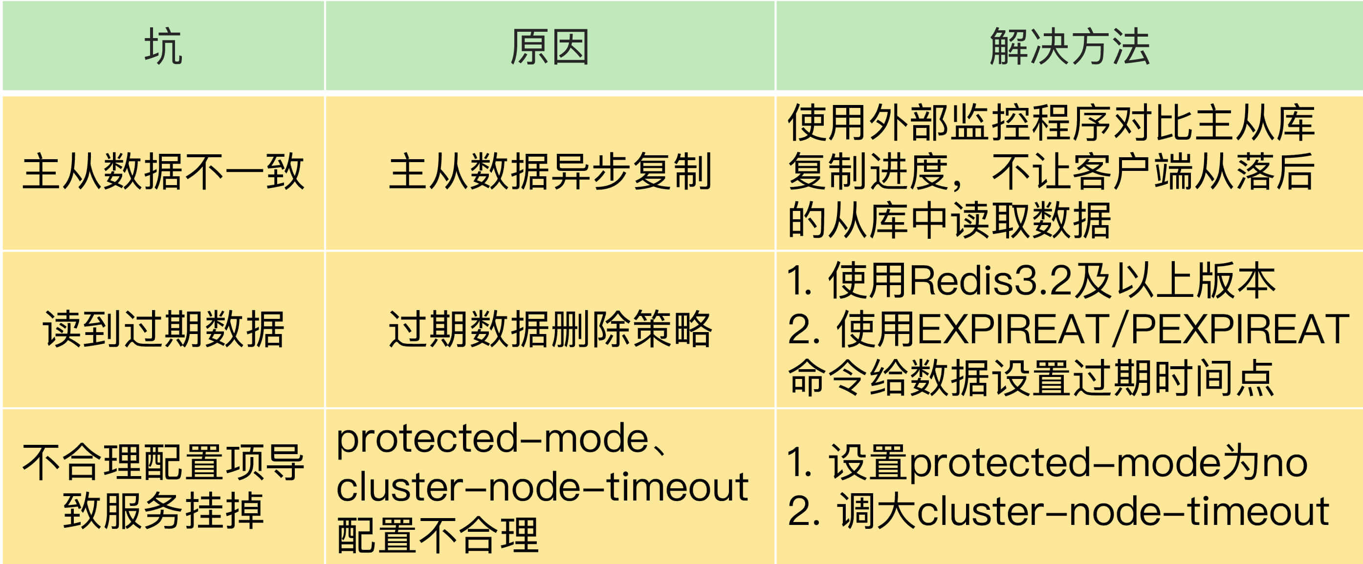 - 主从数据不一致。Redis采用的是异步复制,所以无法实现强一致性保证(主从数据时时刻刻保持一致),数据不一致是难以避免的。我给你提供了应对方法:保证良好网络环境,以及使用程序监控从库复制进度,一旦从库复制进度超过阈值,不让客户端连接从库。